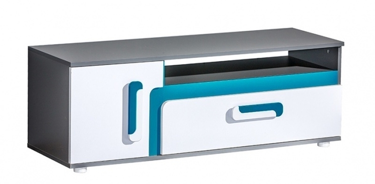 Televizní stolek APETTITA ze sektorové řady, která se vyznačuje netradičním zpracováním barev a originalitou úchytů. Tento styl nábytku zaujme každou mladší generaci. Nábytek je vyroben z kvalitní LTD desky hraněné ABS lištou. Korpus je v barvě šedá antracit, dvířka a čela zásuvek jsou bílé matné, doplňková barva je tyrkys. Úchytky jsou v barevné kombinaci tyrkys/bílá. Sektorový nábytek APETTITA má široký výběr prvků, který Vám zaručí sestavit si dětský nebo studentský pokoj, ložnici či kancelář podle svých potřeb, přání a představ. Dodáváme v demontovaném stavu.CASA 23001