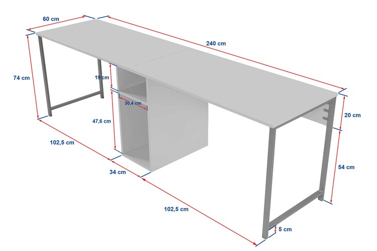S šířkou 240 cm a četnými policemi poskytuje tento stůl dostatek prostoru pro všechny vaše studijní nezbytnosti. Prostřední police o šířce 34 cm a výšce 50 cm nabízí další úložný prostor pro knihy, sešity a další věci. Rozlučte se s nepořádkem a pozdravte organizaci s naším studijním stolem.