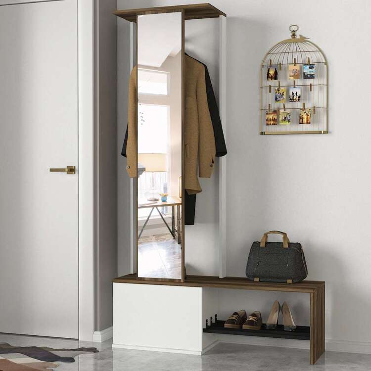 Předsíňová sestava nabízí praktické úložné řešení pro vaši předsíň díky kombinaci věšáků, zrcadla a výklopných přihrádek. Vyrobena z kvalitních materiálů LTD a skla s tloušťkou 18 mm, zaručuje dlouhou životnost a odolnost. Elegantní design v kombinaci bílé a ořechové barvy dodává sestavě moderní a přírodní vzhled, který se snadno integruje do jakéhokoli interiéru.