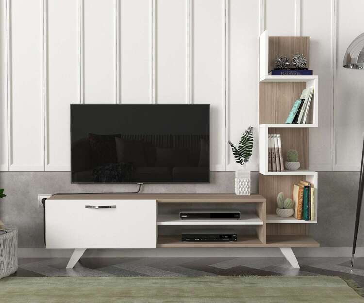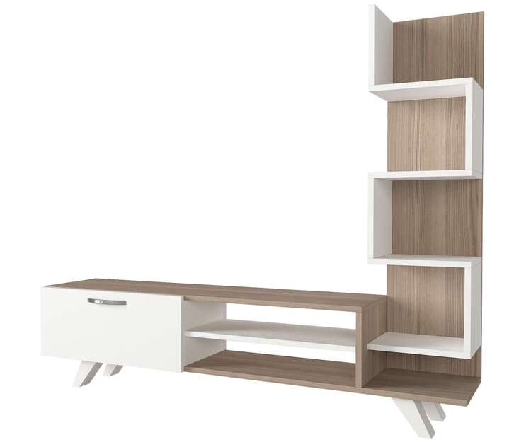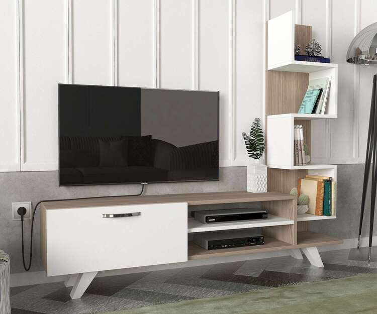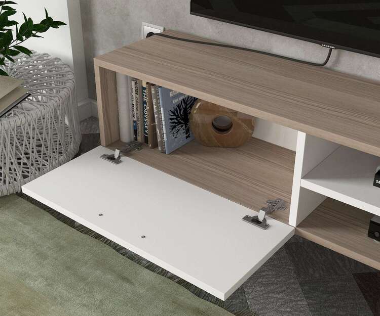 Objevte TV stolek, který elegantně kombinuje praktičnost s moderním designem, ideální pro každý obývací pokoj. Jeho svěží bílá a světle hnědá barva přináší do místnosti pocit klidu a pohody.
