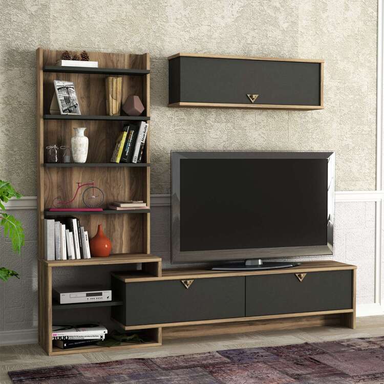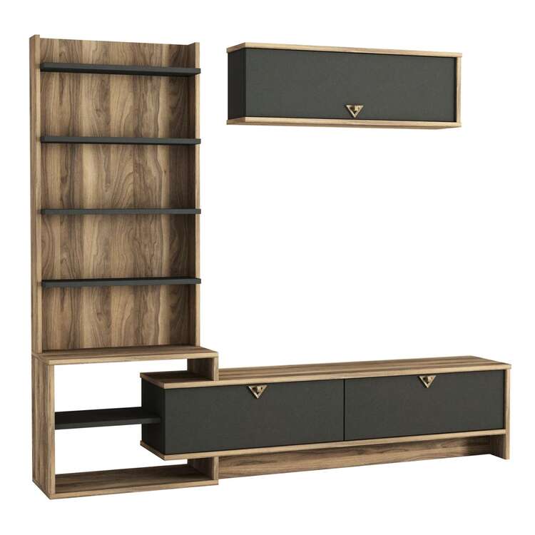 Představujeme obývací stěnu, která skvěle kombinuje elegance a praktickou funkčnost. Její design v antracitové a ořechové barvě dodává interiéru moderní, ale teplý vzhled, zatímco její rozsáhlé rozměry poskytují dostatek prostoru pro vaši multimediální techniku a dekorace.
