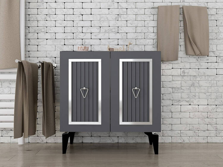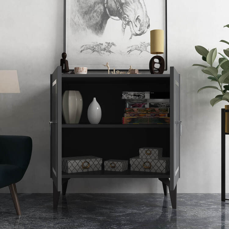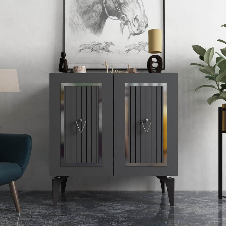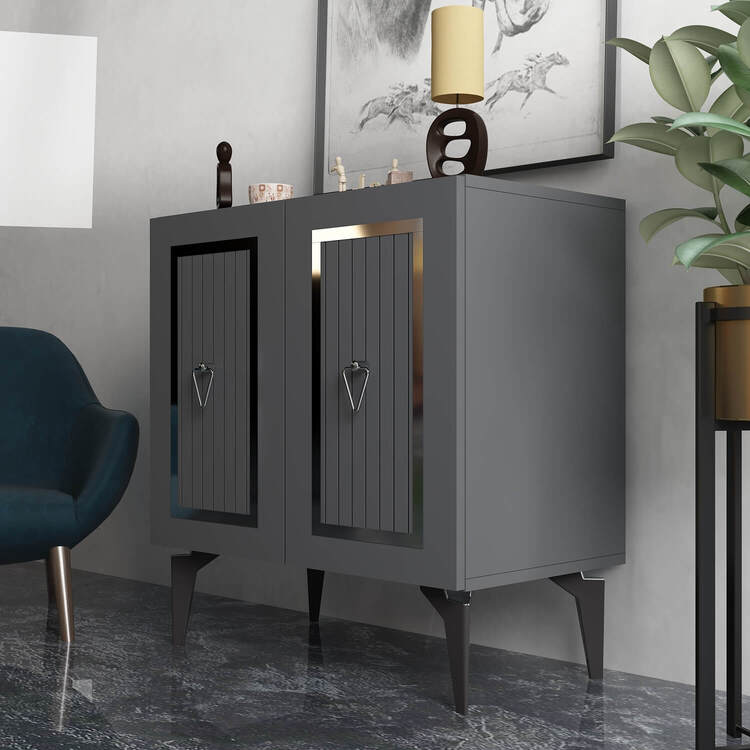 Skříňka je navržena pro ty, kteří chtějí do svého obývacího pokoje přinést nádech luxusu a elegance. Díky kombinaci antracitové a zlaté barvy se stane stylovým středobodem vašeho interiéru. Plná dvířka nabízejí dostatek úložného prostoru, zatímco kovové úchytky přidávají na exkluzivitě.