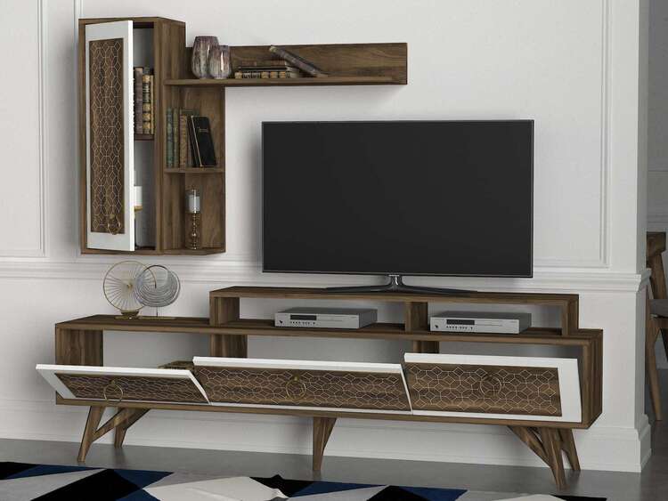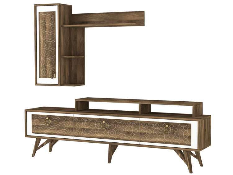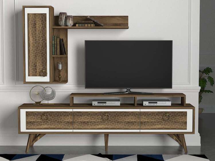 Představujeme obývací stěnu, která přináší do vašeho obývacího pokoje eleganci a moderní design s orientálním nádechem. Tato stylová sestava v kombinaci bílé a ořechové barvy je navržena tak, aby poskytovala praktické a estetické řešení pro vaše multimediální zařízení a další potřeby.