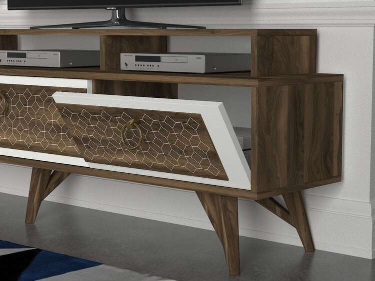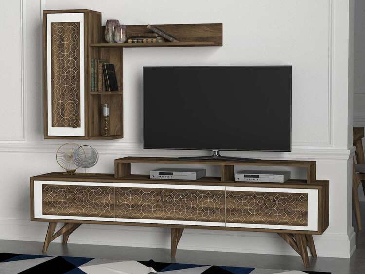 Obývací stěna je ideální volbou pro ty, kteří hledají moderní a funkční nábytek s elegantním a originálním vzhledem. Její kombinace bílé a ořechové barvy a orientální styl přinášejí do vašeho domova svěžest a moderní styl, zatímco poskytují dostatek úložného prostoru pro všechny vaše potřeby.