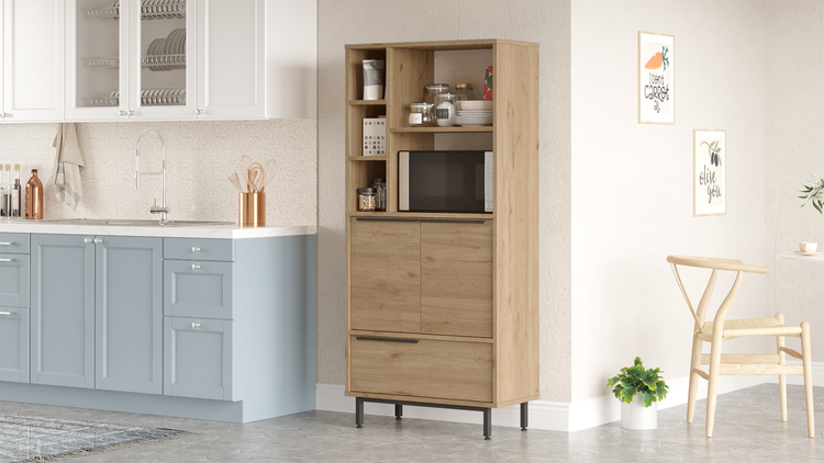Skříňka je praktickým a stylovým řešením pro vaši kuchyň. Vyrobena z kvalitního LTD materiálu a kovu, tato vysoká skříňka nabízí dostatek úložného prostoru a elegantní design. Díky plným dvířkům a regálku poskytuje ideální místo pro mikrovlnku, kuchyňské spotřebiče a další nezbytnosti.