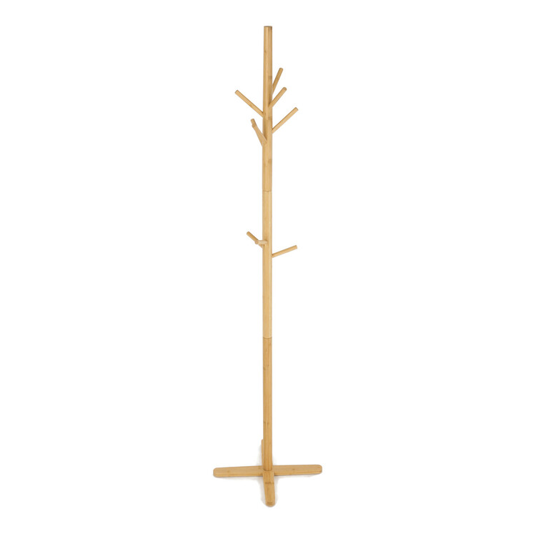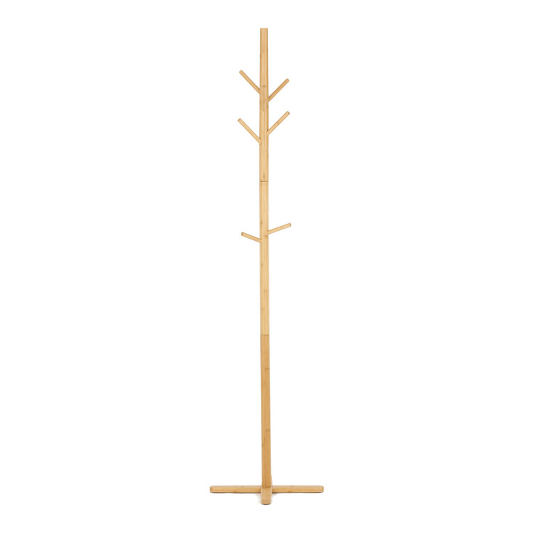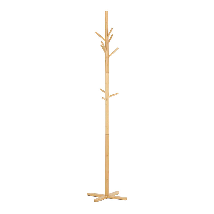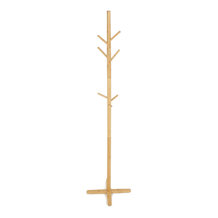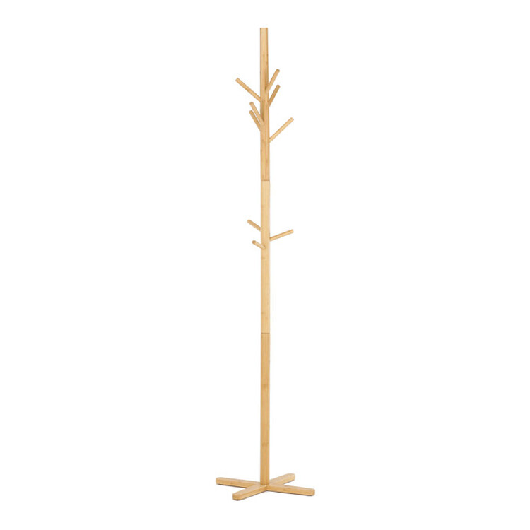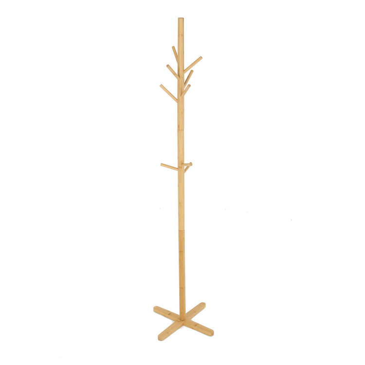 Stojanový věšák z masivního bambusu v přírodním odstínu nabízí praktické a estetické řešení pro ukládání oděvů a doplňků. Jeho pevné provedení zajišťuje stabilitu a dlouhou životnost, přičemž bambusový materiál se snadno udržuje a působí příjemně teplým dojmem. Věšák je vybaven osmi větvemi různých délek, které umožňují efektivní rozložení zavěšených předmětů bez vzájemného překrývání. Křížová základna podporuje stabilitu i při větším zatížení. Výška 180 cm poskytuje dostatek prostoru pro kabáty, šály nebo klobouky v domácnostech i kancelářích.
