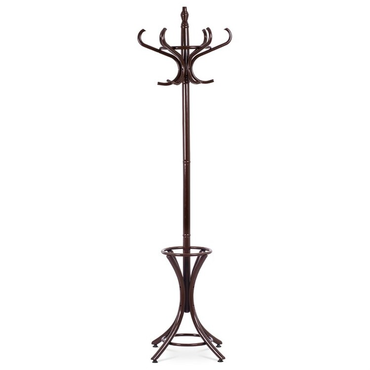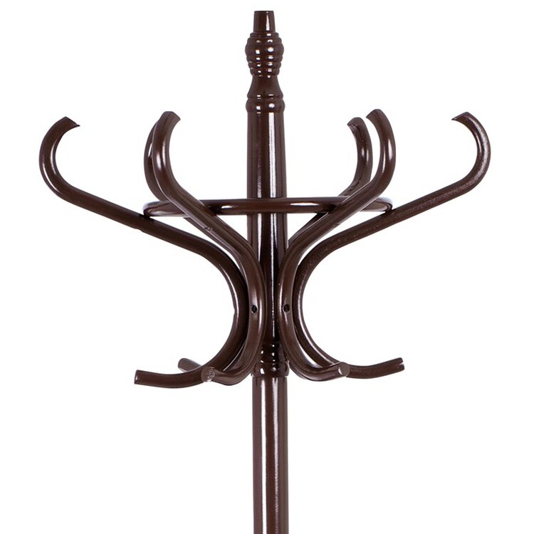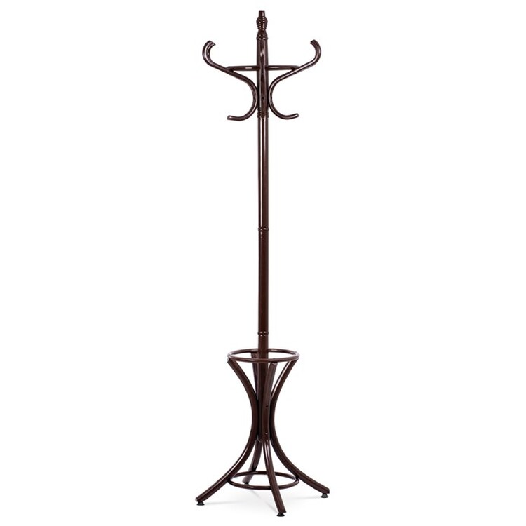 Stojanový věšák z masivu v tmavě hnědém laku kombinuje pevnost topolu a břízy s tradičním designem. Jeho tělo tvoří stabilní noha s elegantně prohnutými háčky uspořádanými ve dvou úrovních, které nabízejí dostatek prostoru pro zavěšení kabátů, klobouků či šál. Pevná základna s rozšířenými nohami zajišťuje stabilitu i při plném zatížení. Výška 185 cm umožňuje pohodlné používání v předsíních, kancelářích či čekárnách. Povrchová úprava tmavým lakem podtrhuje přírodní kresbu dřeva a usnadňuje údržbu.