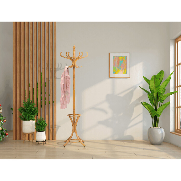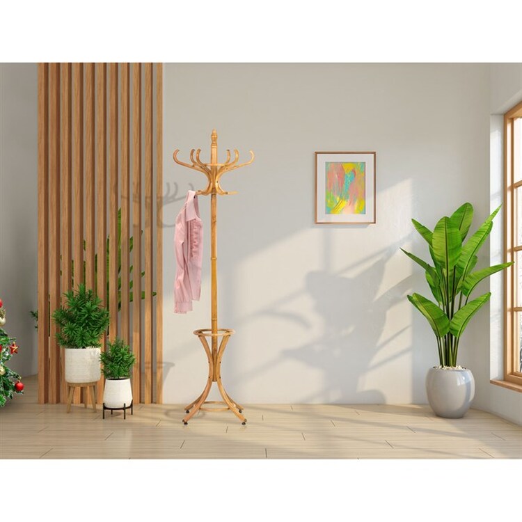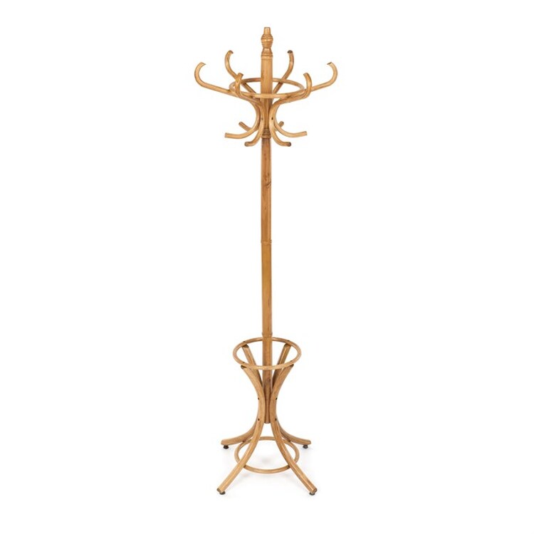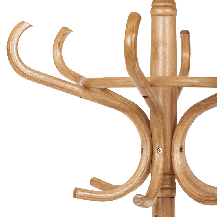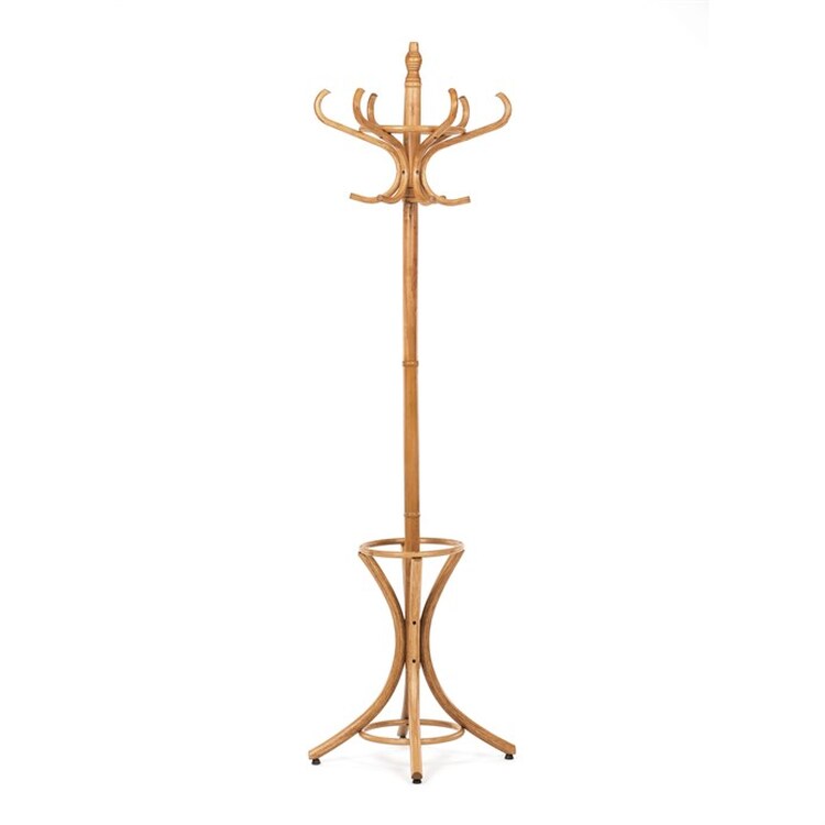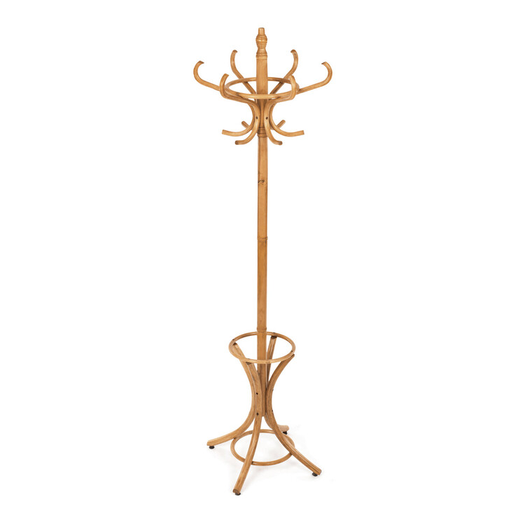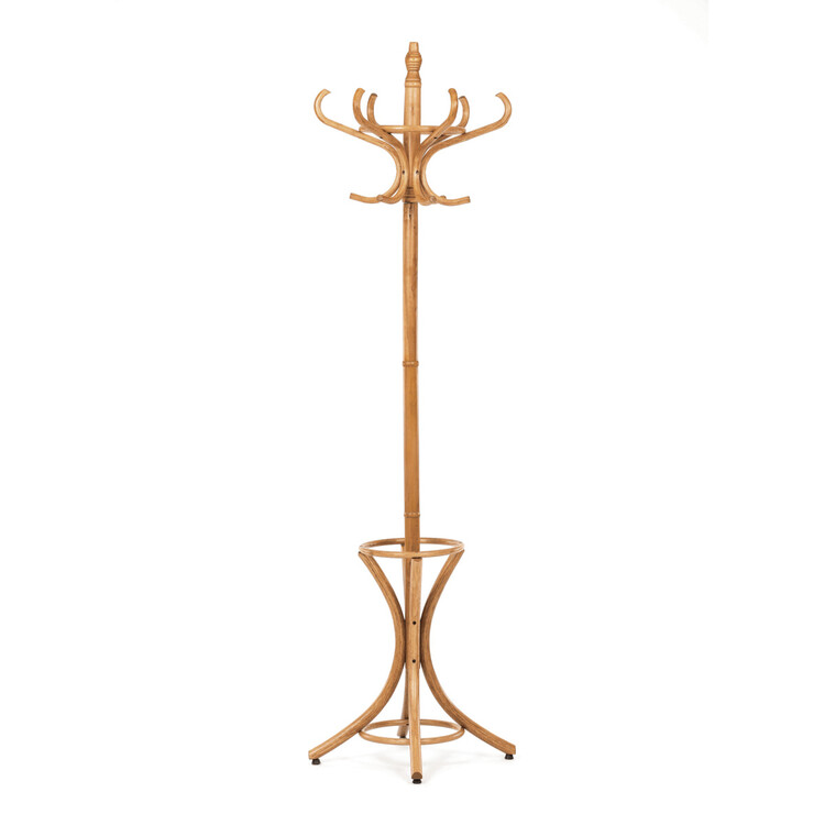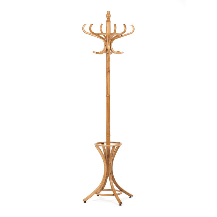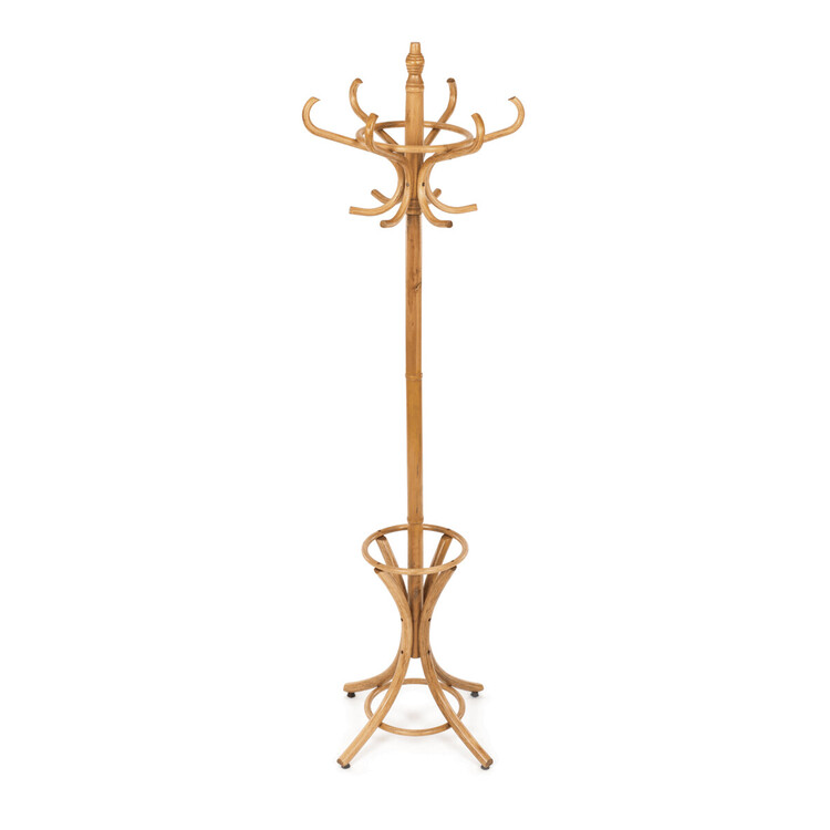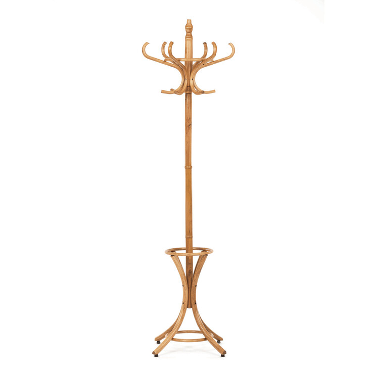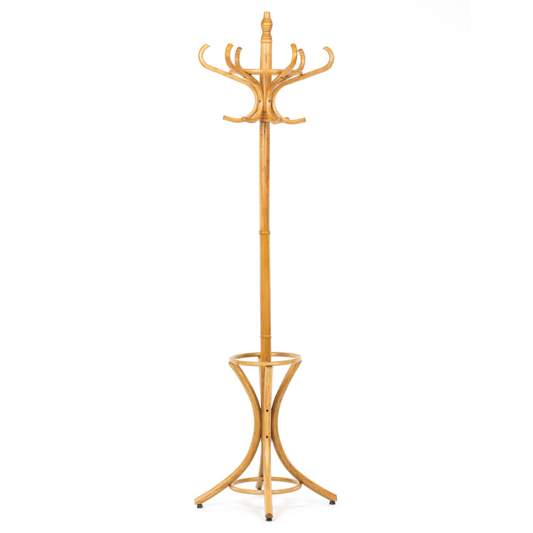 Dřevěný, volně stojící klasický věšák, resp. bestseller mezi věšáky. S jeho desingem se setkáváme již několik generací a jeho obliba je nadčasová. O tom svědčí i fakt, že ke svému původnímu účelu – a to věšení oblečení, začal sloužit i jako součást umění. Setkáváme se s ním např. v galeriích a výstavních prostorách, kde ho vidíme jako stojan na zavěšení obrazů nebo je dekorován živými či umělými květy nebo plastikami.Vyrobený je z ohýbaného topolového dřeva, nosná tyč je z břízy, mořený je v odstínu medový dub a lakovaný transparentním lakem.Výška 185 cm, nosnost je 12 kg rovnoměrné zátěže.