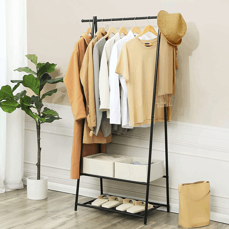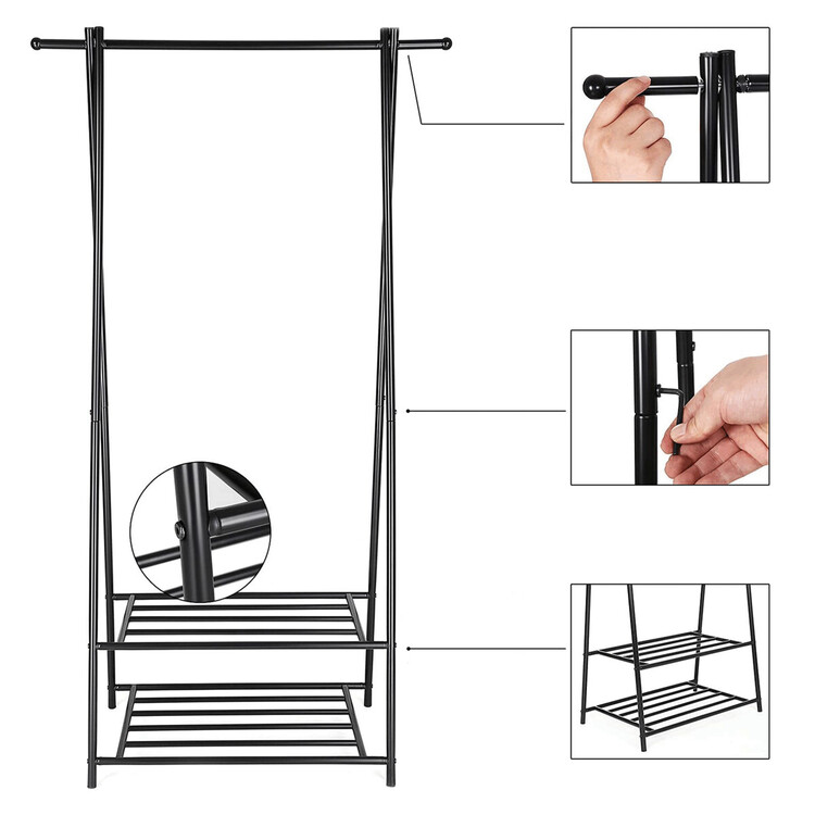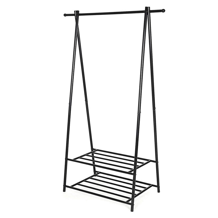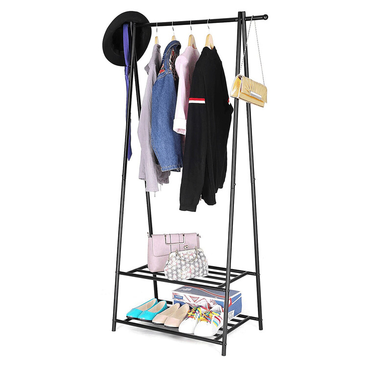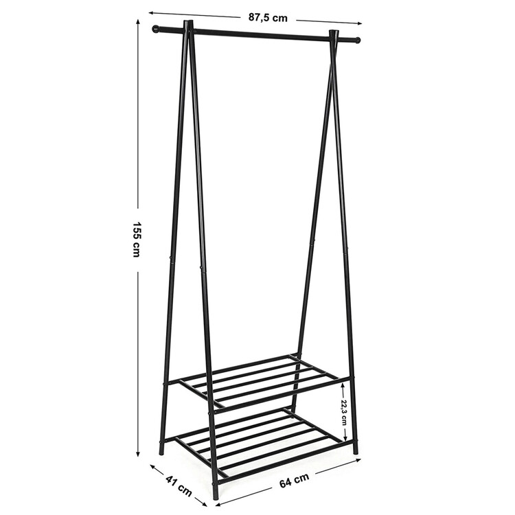 Kovový věšák na šaty v černém provedení nabízí praktické řešení pro uspořádání oděvů i obuvi. Robustní rám je tvořený práškově lakovanými trubkami, které zajišťují stabilitu a dlouhou životnost. Věšák je vybaven horní tyčí pro zavěšení oblečení a dvěma policemi s roštovou konstrukcí, které umožňují odkládání bot nebo dalších doplňků. Díky jednoduchému designu a kompaktním rozměrům se hodí do předsíní, ložnic i šaten, kde pomáhá udržet pořádek a přehlednost. Celková nosnost odpovídá pevnosti materiálu a konstrukce umožňuje snadnou montáž i údržbu.