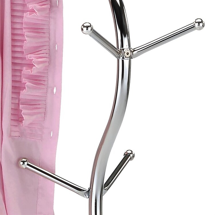 Stojanový věšák s výškou 180 cm je vyroben z pevného chromovaného kovu, který zajišťuje stabilitu a dlouhou životnost. Design věšáku tvoří elegantní zakřivené tyče s osmi kovovými háčky zakončenými kulatými koncovkami, které chrání oděvy před poškozením. Pevná kruhová základna přispívá k vyváženosti a bezpečnému postavení i při plném zatížení do 10 kg. Věšák je vhodný pro domácnosti i kanceláře, kde nabízí praktické a stylové řešení pro zavěšení kabátů, bund či doplňků.