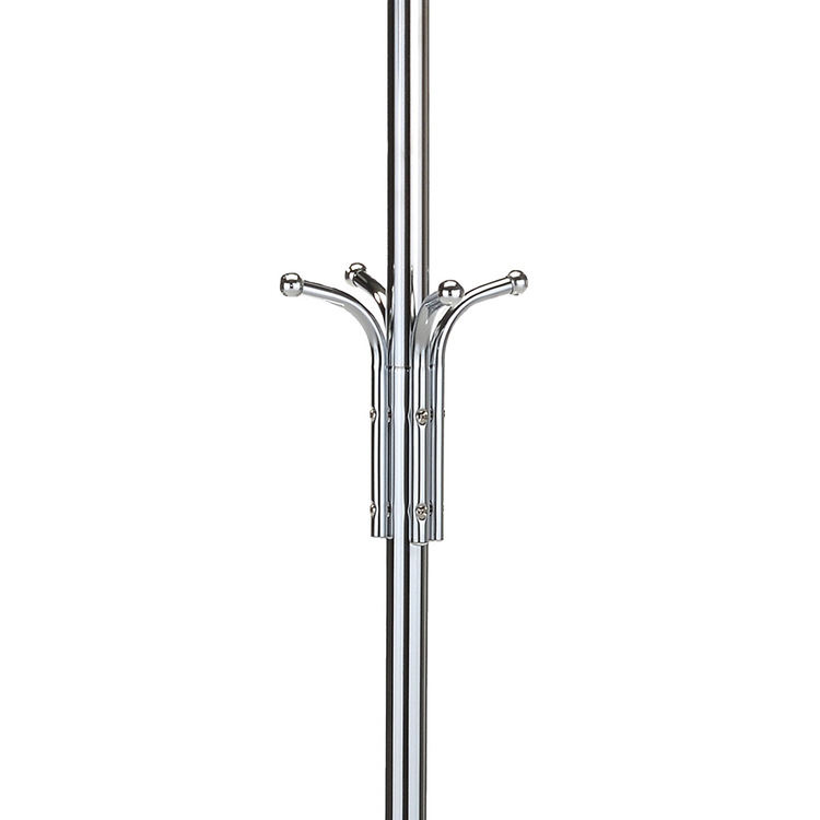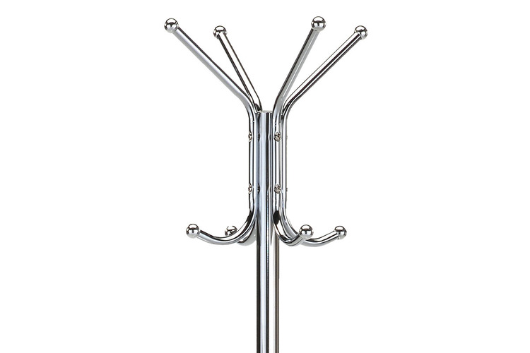 Stojanový věšák s výškou 182 cm je vyroben z pevného kovu s lesklou chromovou povrchovou úpravou, která zajišťuje odolnost a snadnou údržbu. Věšák nabízí celkem dvanáct háčků rozmístěných ve třech úrovních, což umožňuje efektivní uspořádání kabátů, klobouků i doplňků. Stabilní kruhová základna zajišťuje pevnost a bezpečnost při používání, přičemž maximální nosnost činí 10 kg. Díky minimalistickému designu v moderním stříbrném provedení se hodí do různých interiérů, od kanceláří po domácnosti.