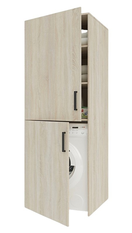 Vysoká vestavná skříň na pračku s praktickým úložným prostorem. V horní části je skříňka s policemi, ve spodní části prostor pro pračku. Korpus i dvířka jsou vyrobeny z kvalitní desky LTD v barvě dub sonoma. Dodáváme v demontovaném stavu.CASA 83082