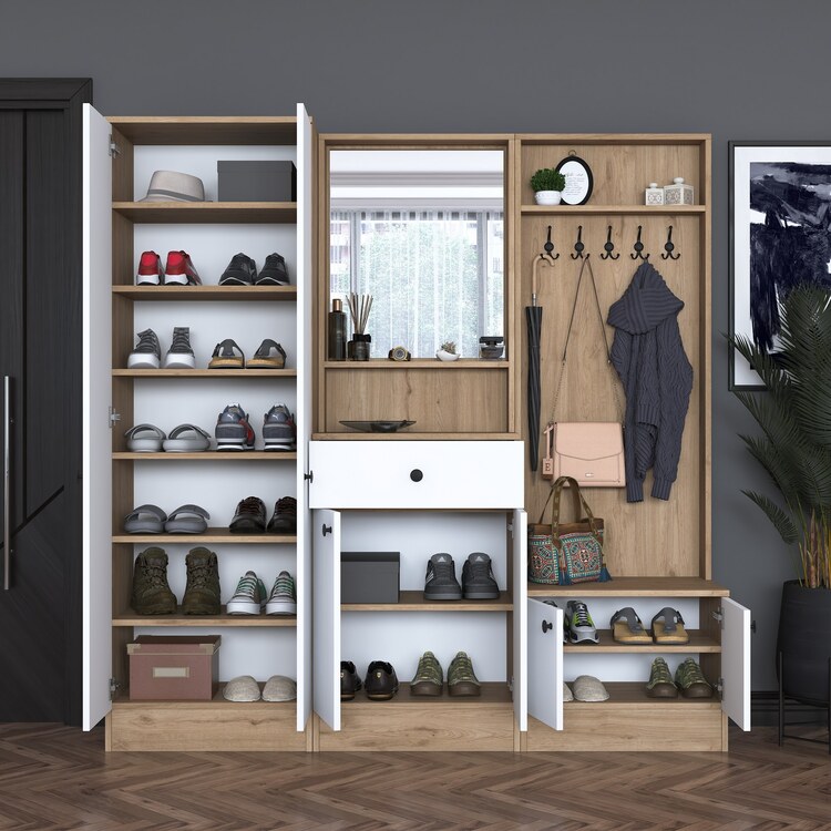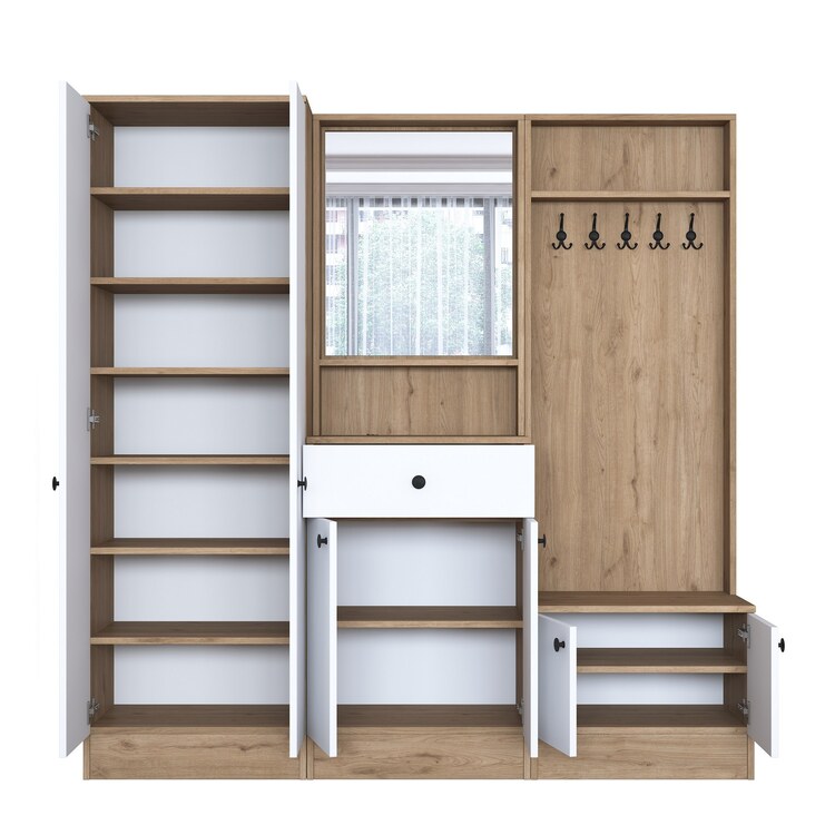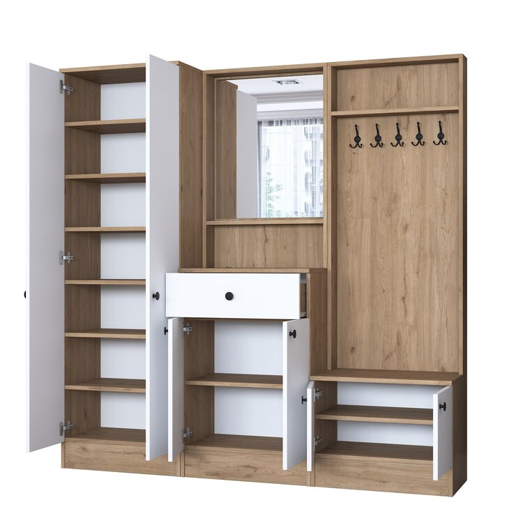 Předsíňová sestava je perfektním řešením pro organizaci vaší předsíně. Kombinace moderní bílé barvy a přírodního dekoru ořechu dodává prostoru eleganci a útulnost. Díky svému chytrému uspořádání vám pomůže udržet předsíň uklizenou a stylovou.