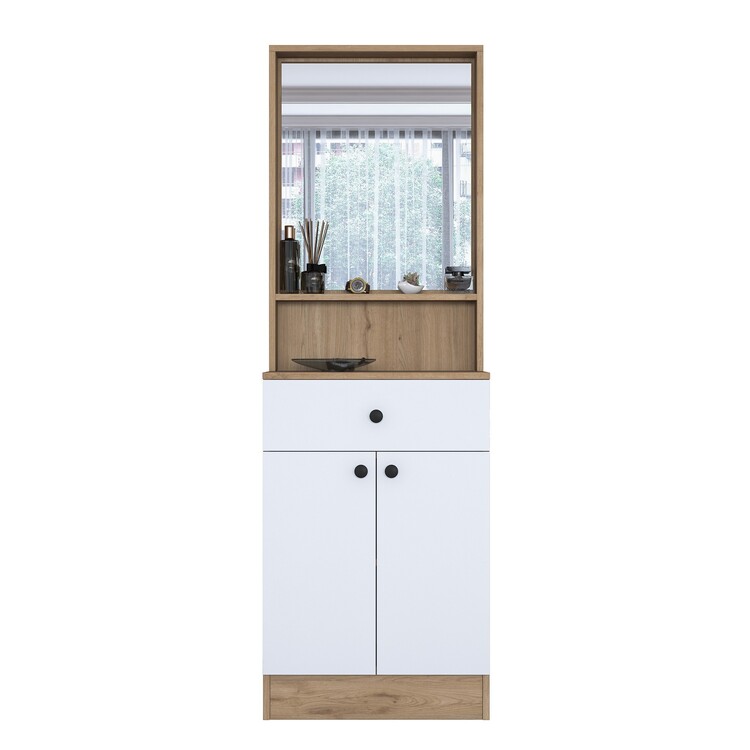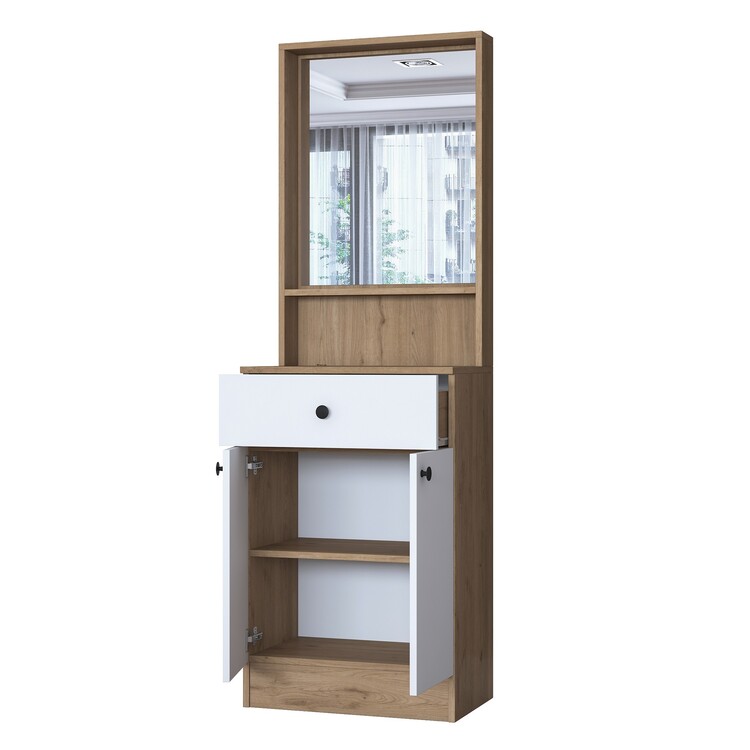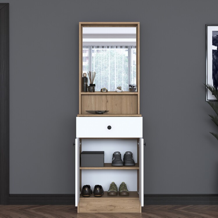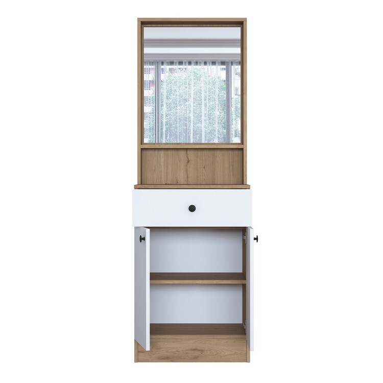 Tato předsíňová sestava nabízí praktické uspořádání prostoru.Skříňka na boty poskytuje dostatek úložného místa pro obuv, zatímco elegantní zrcadlo opticky zvětšuje prostor a zvyšuje světlost místnosti. Díky jedné zásuvce máte navíc prostor na klíče, doplňky nebo další drobnosti, které potřebujete mít vždy po ruce.