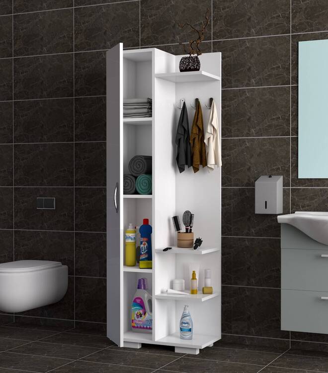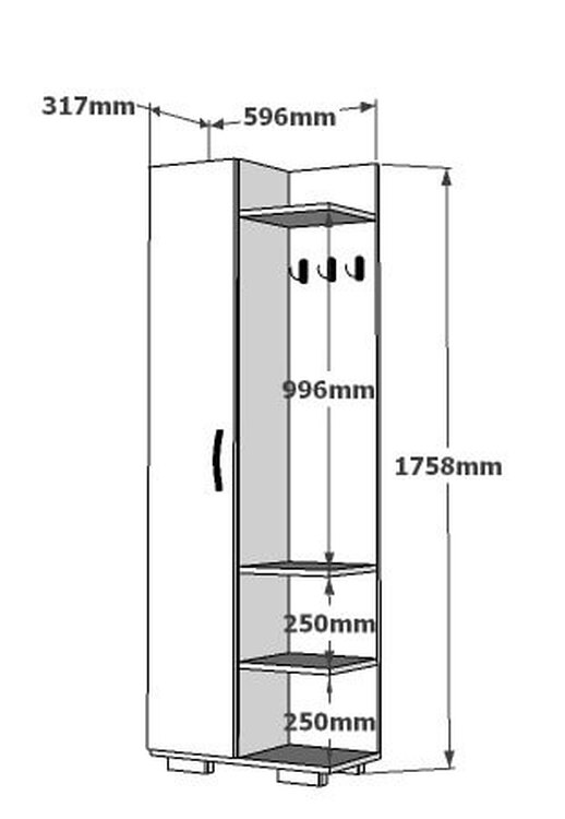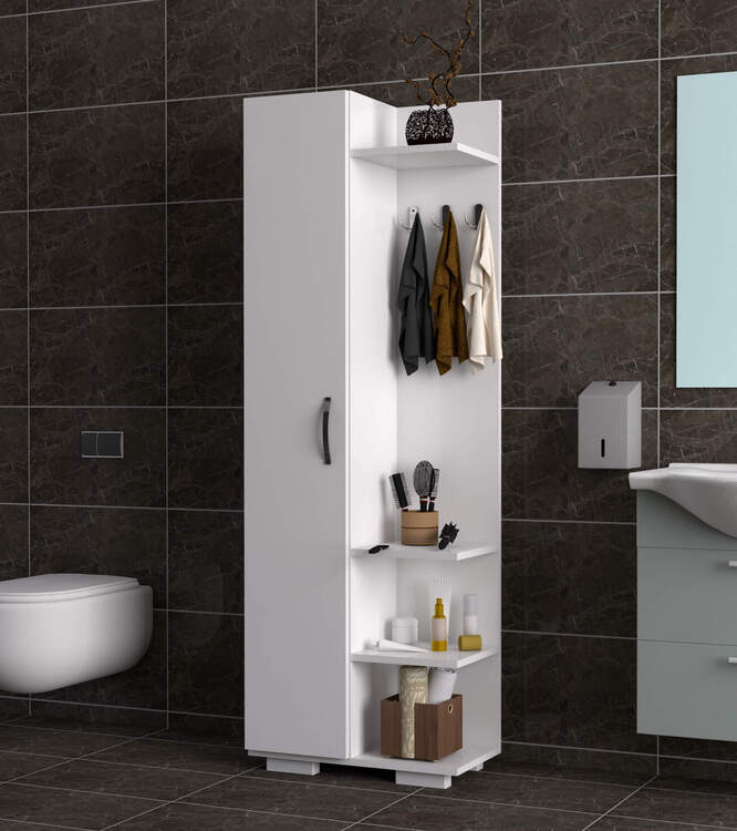 Skříňka přináší do vašeho domova dokonalou kombinaci funkčnosti a skandinávského stylu. Vysoká skříňka s regálkem a věšáky je navržena tak, aby efektivně využívala prostor a poskytovala dostatek úložného místa pro různé potřeby v koupelně, obývacím pokoji nebo kuchyni.