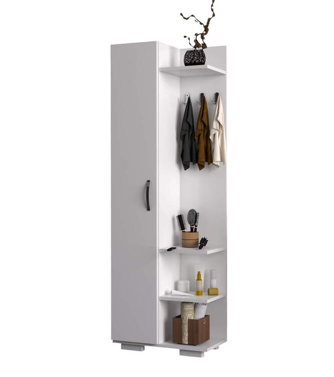 Skříňka je dodávána v demontovaném stavu s přiloženým návodem na snadnou montáž. Její čistý bílý design a praktické prvky, jako jsou regálky a věšáky, ji činí univerzálním doplňkem, který se hodí do každého moderního interiéru. Tato skříňka je perfektní volbou pro každého, kdo hledá stylové a funkční úložné řešení.