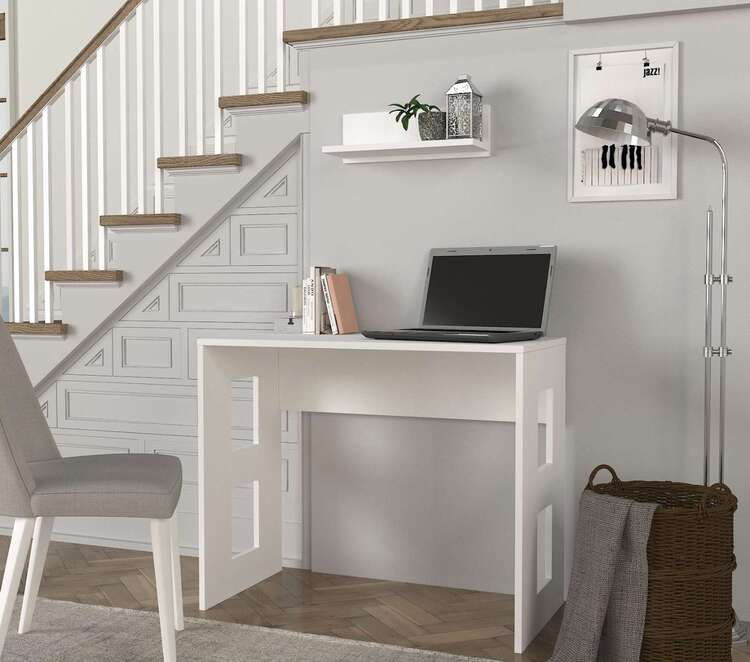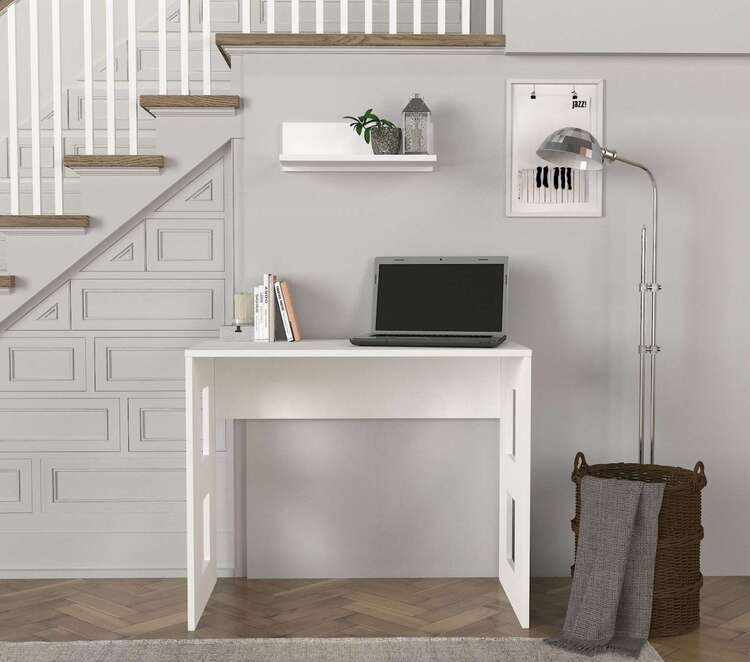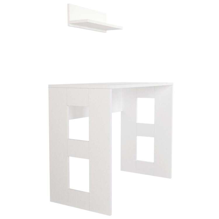Písací stůl je vyroben z kvalitního LTD materiálu s tloušťkou 18 mm, což zajišťuje jeho pevnost a dlouhou životnost. Elegantní bílá barva dodává stolu moderní a čistý vzhled, který se hodí do jakéhokoliv interiéru. Sestava obsahuje nejen praktický psací stůl, ale také nástěnnou polici, která rozšiřuje úložné možnosti a pomáhá udržet váš pracovní prostor organizovaný.