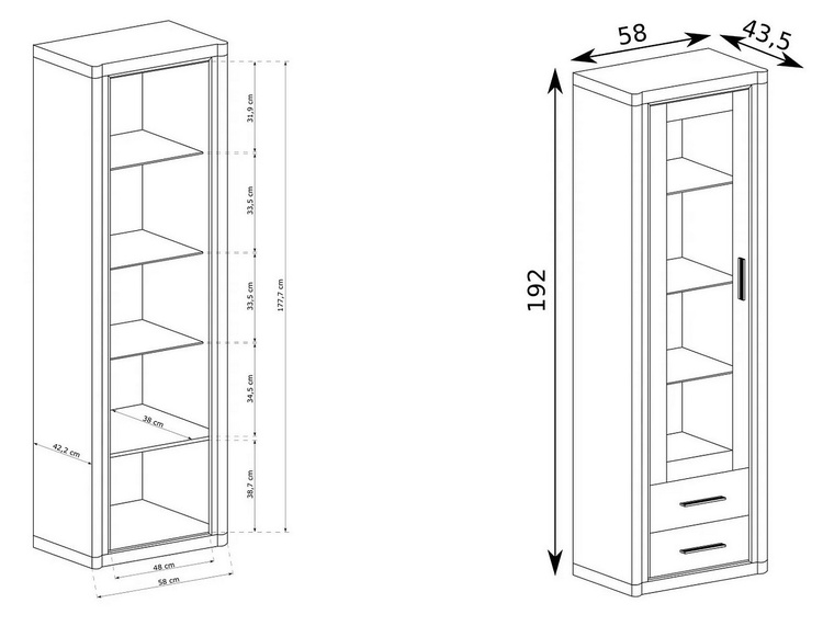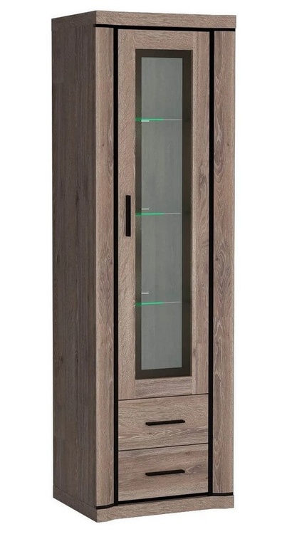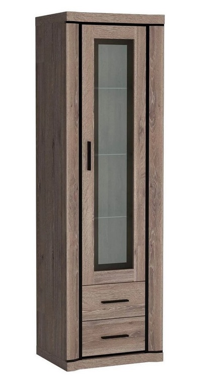 Vitrína 1-dveřová ze sektorové řady má prosklené dveře, za nimi jsou 3 skleněné poličky, dole jsou dvě zásuvky. Má zajímavé provedení v podobě netradičně vyřezávaných vrchních a spodních desek. Systém je exkluzivní kolekce navržena v moderním duchu. Celá řada se vyznačuje masivním vzhledem a jednoduchými tvary. Nábytek je vyroben z kvalitního LTD s lištami z MDF, součástí nábytku jsou desky 48 mm, vše opatřeno ABS páskou. Barevné provedení – dub lanýž. Má široký výběr komponentů, díky kterým lze vybavit nejen obývací pokoj, ale i jídelnu nebo kancelář. Vitrína má univerzální otvírání dvířek. Dodáváme v demontovaném stavu.CASA 71003