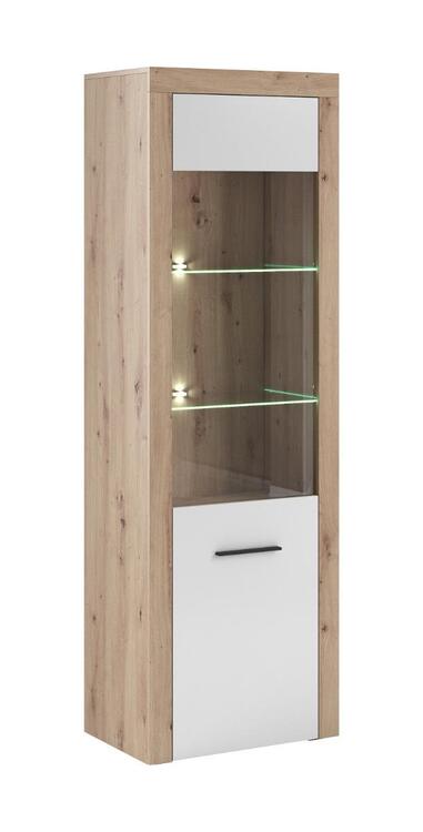 Vitrína jednodveřová v moderním a nadčasovém stylu, je vyrobena z kvalitní LTD desky. Korpus je v barvě dub artisan, dvířka jsou v barevném provedení bílá lesk, částečně prosklená. V naší nabídce naleznete více variant nábytku této řady. Dodáváme v demontovaném stavu.CASA 85031