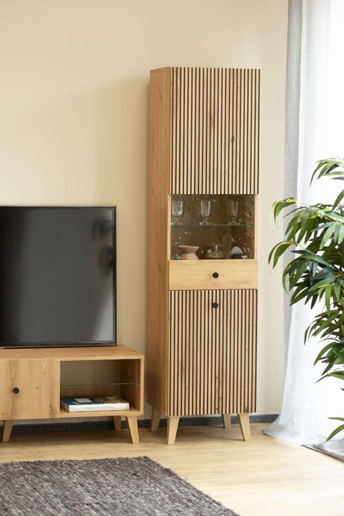 Vitrína dvoudveřová z části prosklená je vyrobena z kvalitní LTD v barevném provedení dub artisan/černá. Netradiční frézování předních dvířek v kombinaci s minimalistickými úchyty a vysokými nožkami, dodává této kolekci moderní vzhled. Nabídka komponentů této sektorové řady umožňuje sestavit si nábytek dle vlastních představ. Dodáváme v demontovaném stavu.CASA 85025
