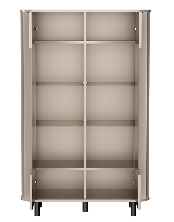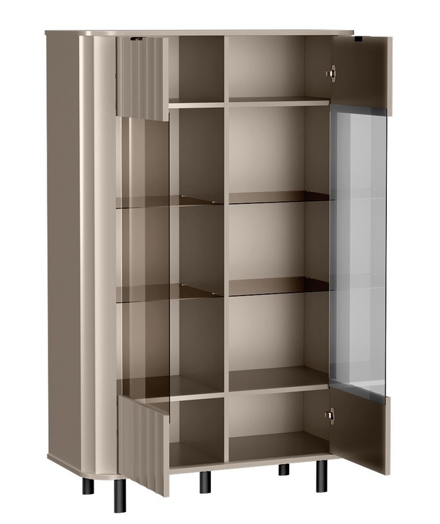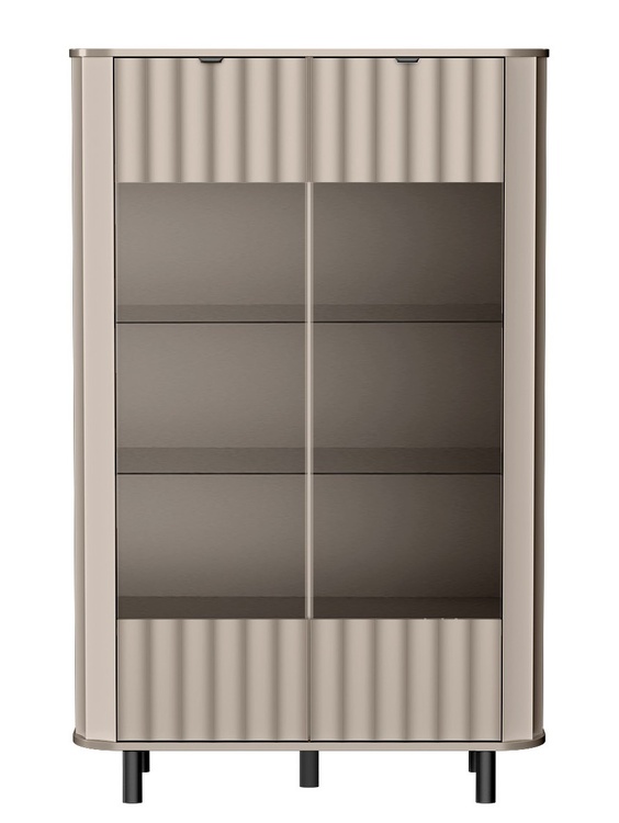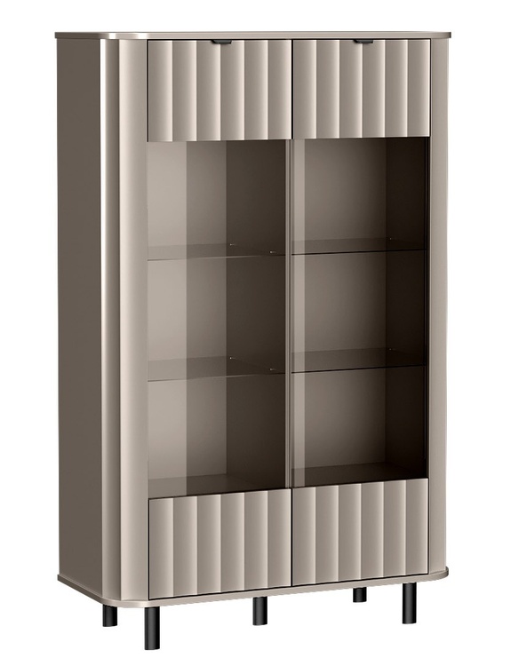 Vitrínu podepírají štíhlé kovové ocelové nožky práškově lakované