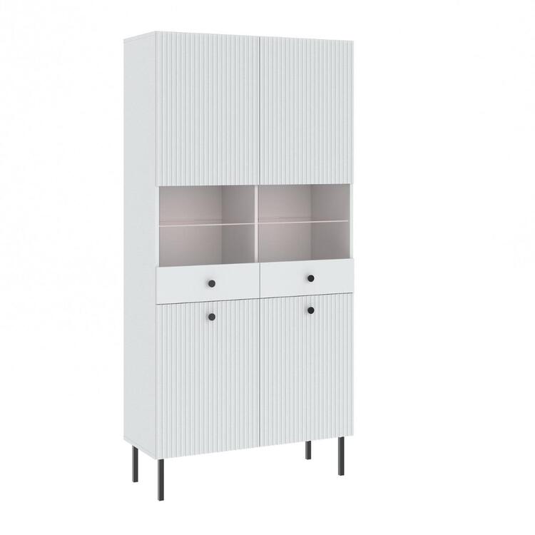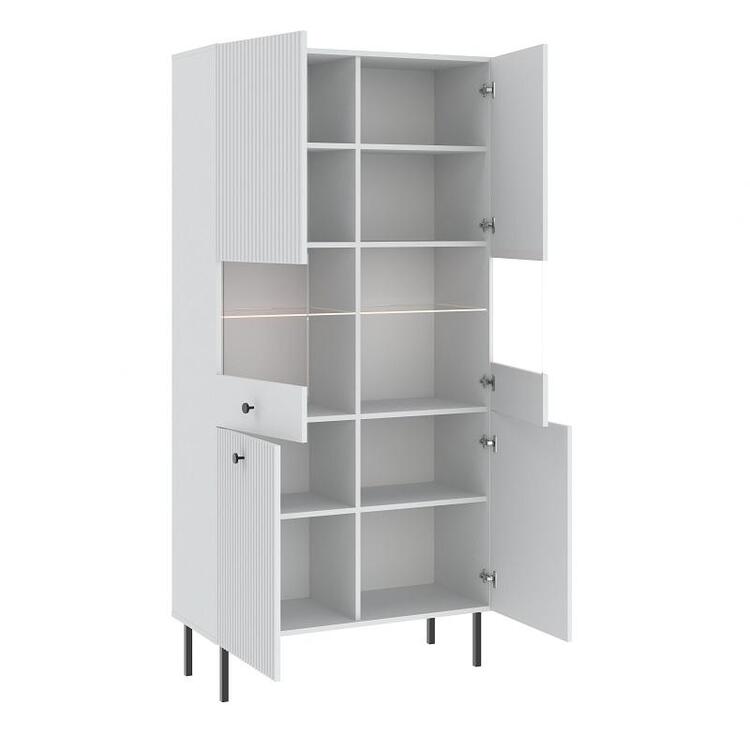 Vitrína vysoká čtyřdveřová v elegantním stylu, je vyrobena z kvalitní LTD desky v barevném provedení bílá. Přední část nábytku je doplněna dekorem frézovaných dveří. Vysoké kovové nožky nábytku a úchyty jsou v barevném provedení černá. V naší nabídce naleznete více variant nábytku této řady.... více informací o zboží