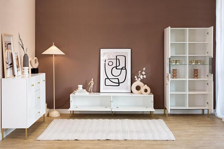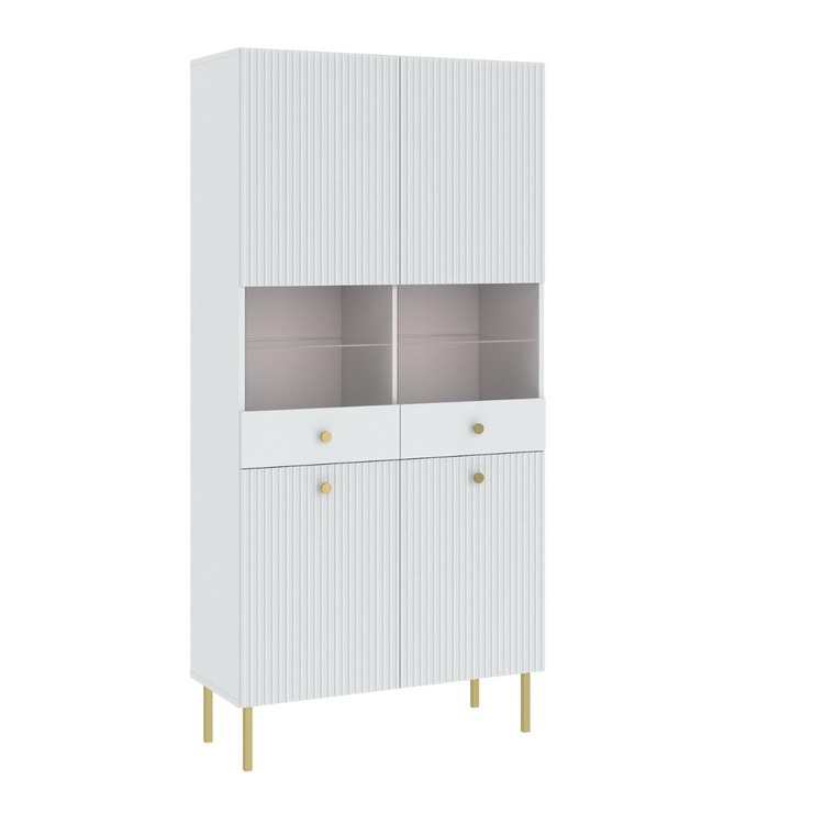 Vitrína vysoká čtyřdveřová v elegantním stylu, je vyrobena z kvalitní LTD desky v barevném provedení bílá. Přední část nábytku je doplněna dekorem frézovaných dveří. Vysoké kovové nožky nábytku a úchyty jsou v barevném provedení zlatá. V naší nabídce naleznete více variant nábytku této řady.... více informací o zboží