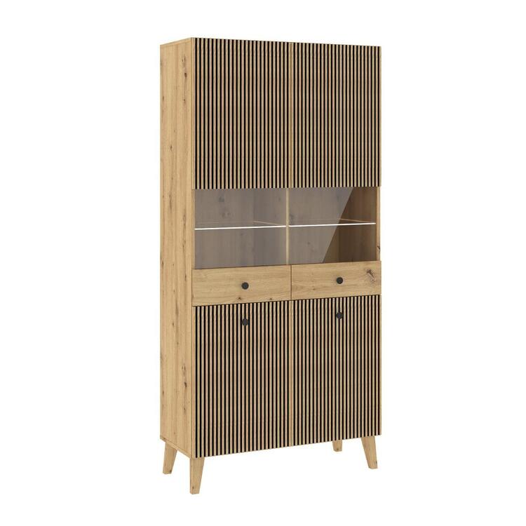 Vitrína čtyřdveřová z části prosklená je vyrobena z kvalitní LTD v barevném provedení dub artisan/černá. Netradiční frézování předních dvířek v kombinaci s minimalistickými úchyty a vysokými nožkami, dodává této kolekci moderní vzhled. Nabídka komponentů této sektorové řady umožňuje sestavit... více informací o zboží