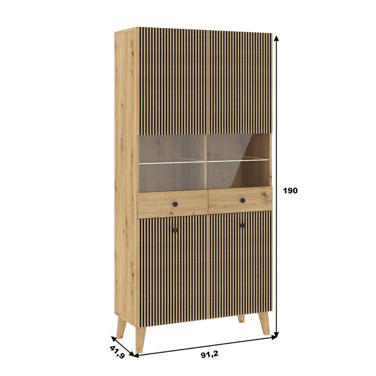 Vitrína čtyřdveřová z části prosklená je vyrobena z kvalitní LTD v barevném provedení dub artisan/černá. Netradiční frézování předních dvířek v kombinaci s minimalistickými úchyty a vysokými nožkami, dodává této kolekci moderní vzhled. Nabídka komponentů této sektorové řady umožňuje sestavit si nábytek dle vlastních představ. Dodáváme v demontovaném stavu.CASA 85025