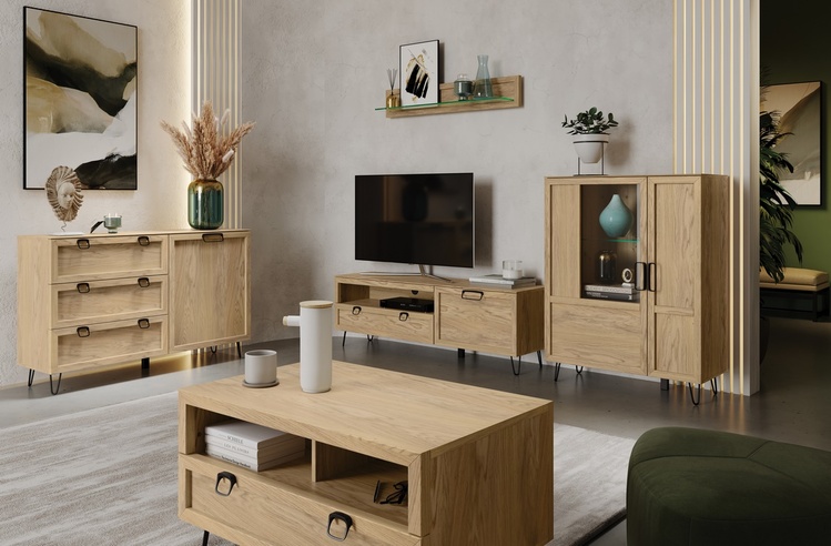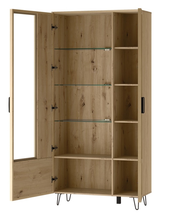 Vitrína dvoudveřová v nadčasovém provedení. Korpus je vyroben z přírodní dýhy v barvě dub artisan, dvířka jsou vyrobeny z masivu v provedení dub artisan olejovaný v kombinaci s tvrzeným sklem. Součástí vitríny je také LED osvětlení. Úchyty a nožky jsou kovové v barvě černá mat. Dvířka disponují systémem tichého dovírání. Dodáváme již ve smontovaném stavu.CASA 75099