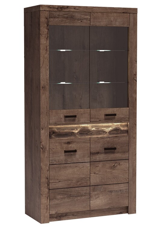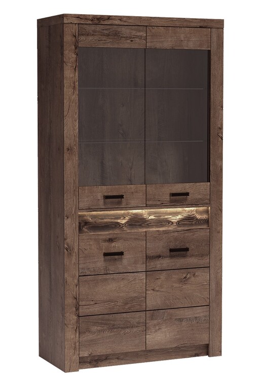 Vitrína s dvířky a policemi. Systém je exkluzivní kolekce navržena v moderním duchu. Vsazením LED osvětlení do ozdobné rýhované lišty, které najdete v naší další nabídce k dokoupení, je zvýrazněn rustikální vzhled masivního dřeva. Možnost dokoupení LED bodového osvětlení i u skleněných polic.... více informací o zboží