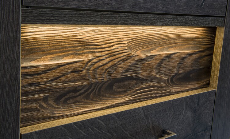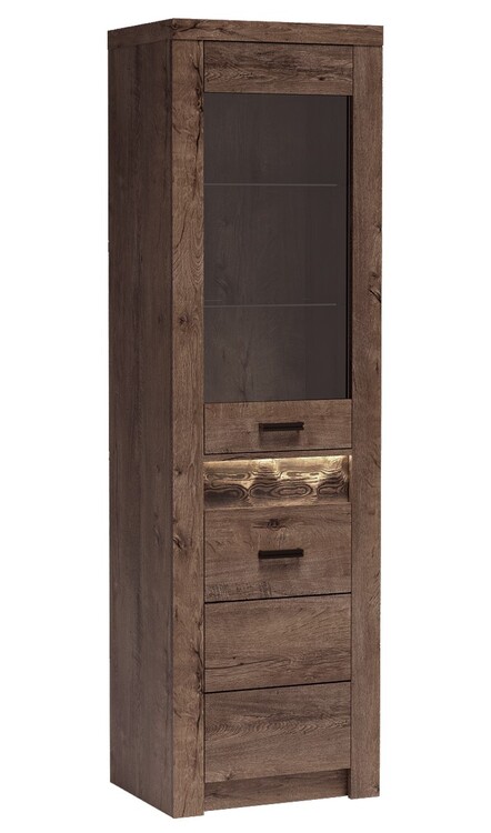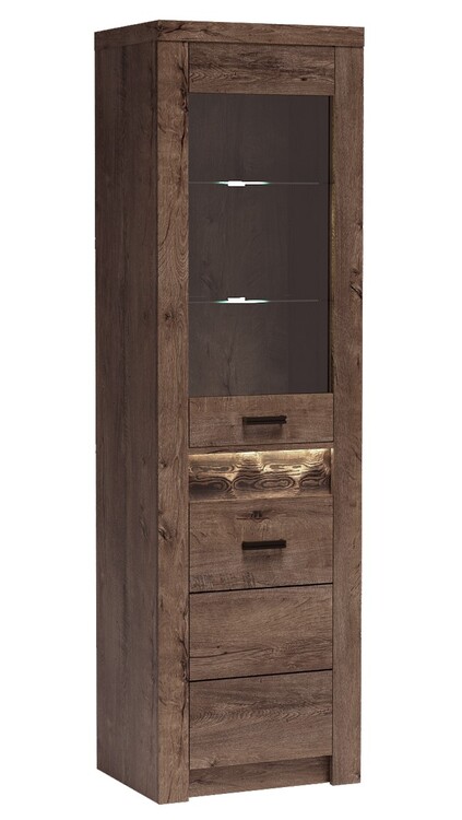Vitrína s dvířky a policemi. Systém je exkluzivní kolekce navržena v moderním duchu. Vsazením LED osvětlení do ozdobné rýhované lišty, které najdete v naší další nabídce k dokoupení, je zvýrazněn rustikální vzhled masivního dřeva. Možnost dokoupení LED bodového osvětlení i u skleněných polic.... více informací o zboží