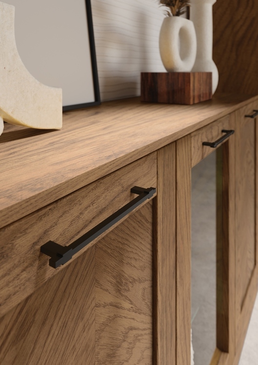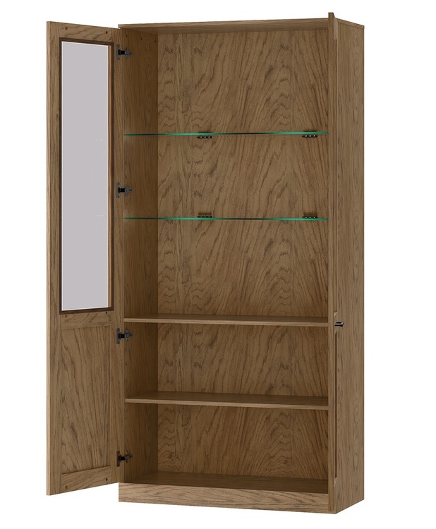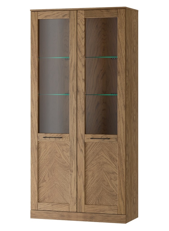 Vitrína dvoudveřová v nadčasovém provedení. Korpus je vyroben z přírodní dýhy v barvě dub rustikální, dvířka jsou vyrobeny z masivu v kombinaci s přírodní dýhou v zajímavém dekoru rybí kost v provedení dub rustikální olejovaný. Součástí vitríny je také LED osvětlení. Úchyty jsou kovové v barvě černá mat. Dvířka disponují systémem tichého dovírání. Dodáváme již ve smontovaném stavu.CASA 75098