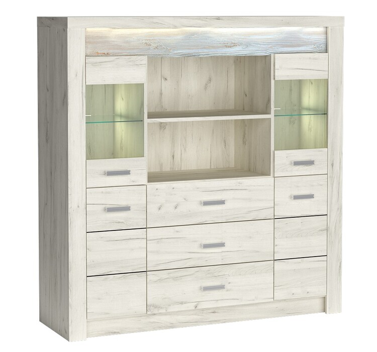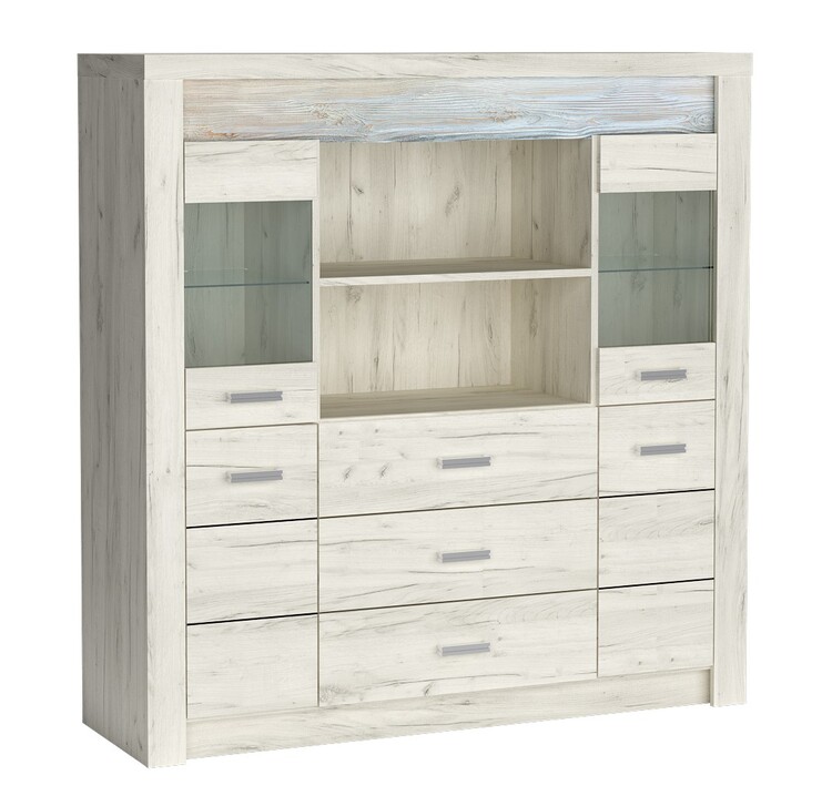 Vitrínová komoda ze sektorové řady. Komoda má po stranách 2 vitríny a 2 skříňky, za kterými je jedna polička, uprostřed jsou 3 zásuvky a nad nimi jedna polička. Systém je exkluzivní kolekce navržena v moderním duchu. Vsazením LED osvětlení do ozdobné rýhované lišty, které najdete v naší další nabídce k dokoupení, je zvýrazněn rustikální vzhled masivního dřeva. Možnost dokoupení LED bodového osvětlení i u skleněných polic. Celá řada se vyznačuje elegancí a jednoduchými tvary, které zaručují plné využití prostoru. Nábytek je vyroben z kvalitního lamina s ABS hrany ( 0,5–0,8 mm ). Barevné provedení jasan bílý. Dodáváme v demontovaném stavu.CASA 71007