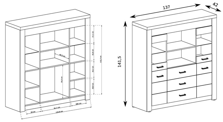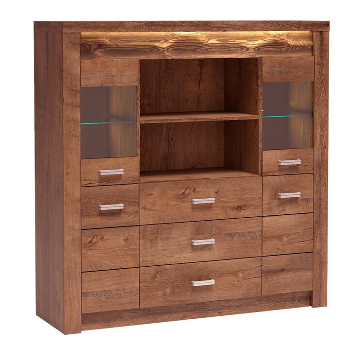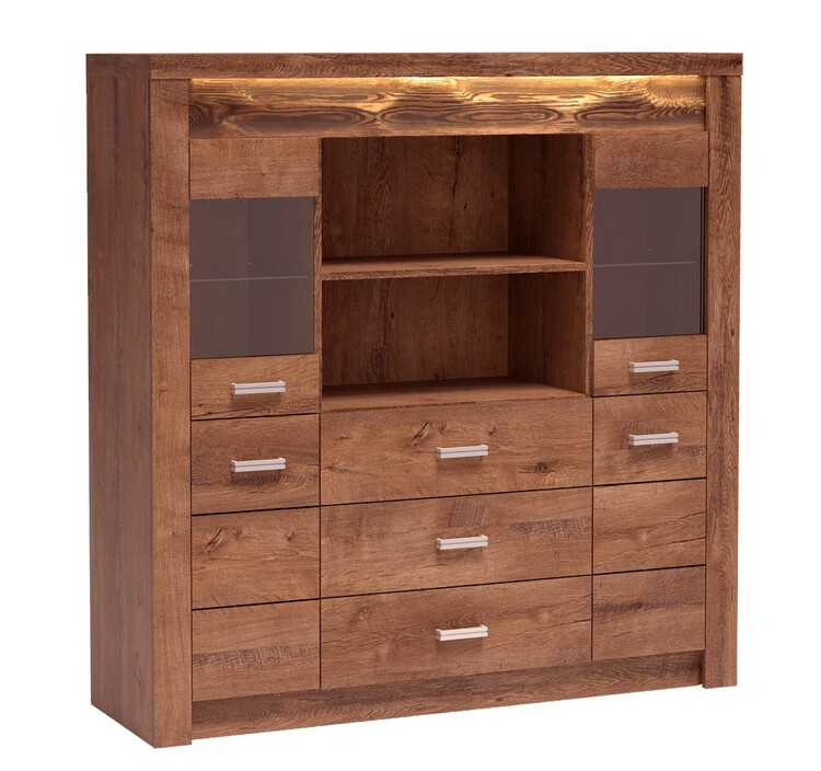 Vitrínová komoda ze sektorové řady. Komoda má po stranách 2 vitríny a 2 skříňky, za kterými je jedna polička, uprostřed jsou 3 zásuvky a nad nimi jedna polička. Systém je exkluzivní kolekce navržena v moderním duchu. Vsazením LED osvětlení do ozdobné rýhované lišty, které najdete v naší další... více informací o zboží