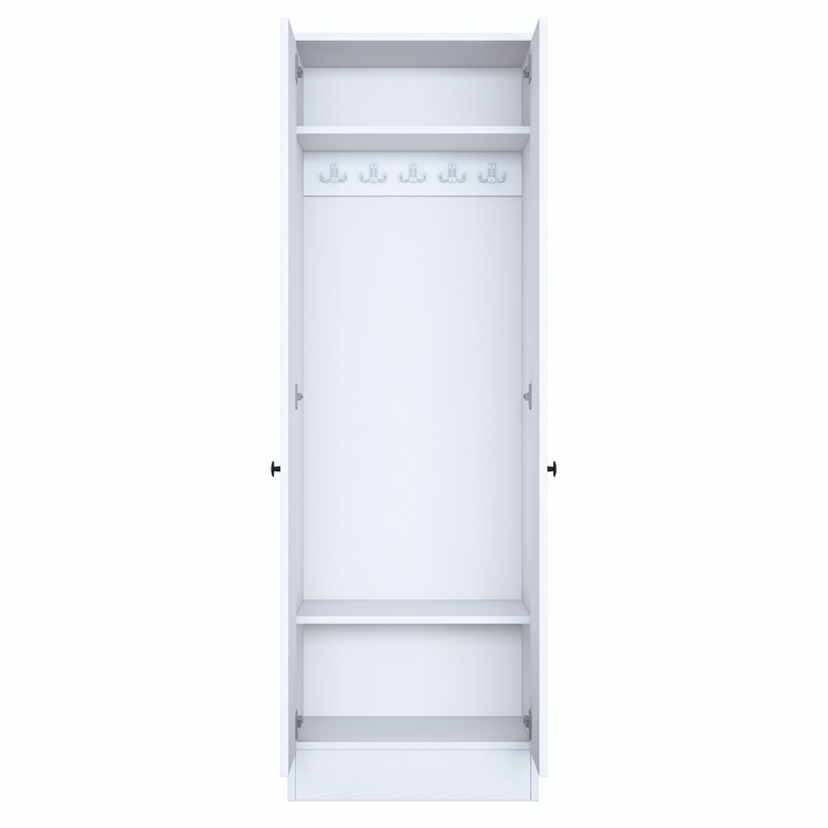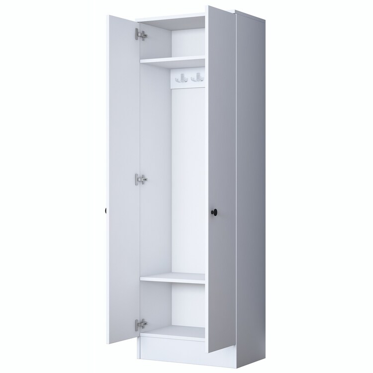 Policová skříň je ideálním řešením pro organizaci a uspořádání prostoru ve vaší předsíni. Díky čistě bílému provedení a skandinávskému stylu přináší do interiéru svěžest a eleganci. Praktické plné dvířka umožňují diskrétní uložení všech potřebných věcí.