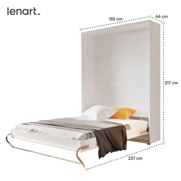 Vysoká výklopná postel 140 bílá lesk/bílá mat. Korpus nábytku je v matné bílé barvě, čelo nábytku je v bílém lesku. Rozměry viz obrázek. Každý kus nábytku v novém provedení Vám umožní dokonale zařídit menší ložnici nebo obývací, dětský či studentský pokoj. Se sklápěcí postelí Vás už nebude trápit malý prostor Vaší domácnosti. Díky stabilní konstrukci zaručuje pohodlný odpočinek. Bezpečnost je velmi důležitá a tak má naše sklápěcí postel mechanismus, kterým zablokujete postel proti samovolnému otevření. Při sklápění postele FUNKCE STOP zajistí bezpečné otevírání i zavírání. Tento výjimečný systém Vám umožní manipulaci pouze jedním prstem. Když je postel sklopená, vypadá jako běžná skříň. Vyklopením se vytáhne celá šířka postele. Při rozložení postele má hloubku 237 cm. Rám je nutno přišroubovat ke zdi, nosnost postele je 200 kg. Rošt postele je v ceně, matrace není součástí, je potřeba ji dokoupit. Doporučujeme velikost 140 × 200 x výšku do 18 cm. Po sklopení postele vzniká prostor pod postelí o výšce 20,4 cm. Nábytek je vyroben z kvalitního lamina s ABS hranou. Lamino je odolné proti poškrábání, poškození, vlhkosti a vysokým teplotám. Postel nabízíme v několika velikostech a barevných provedeních. Dodáváme v demontovaném stavu.Můžete si prohlédnout prezentační video, klikněte <a href=" CASA 73005
