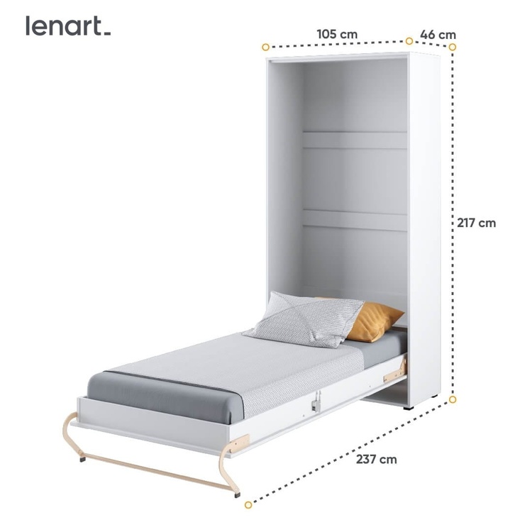 Vysoká výklopná postel 90 bílá mat. Rozměry viz obrázek. Každý kus nábytku v novém provedení Vám umožní dokonale zařídit menší ložnici nebo obývací, dětský či studentský pokoj. Se sklápěcí postelí Vás už nebude trápit malý prostor Vaší domácnosti. Díky stabilní konstrukci zaručuje pohodlný odpočinek. Bezpečnost je velmi důležitá a tak má naše sklápěcí postel mechanismus, kterým zablokujete postel proti samovolnému otevření. Při sklápění postele FUNKCE STOP zajistí bezpečné otevírání i zavírání. Tento výjimečný systém Vám umožní manipulaci pouze jedním prstem. Když je postel sklopená, vypadá jako běžná skříň. Při rozložení postele má hloubku 237 cm. Vyklopením se vytáhne celá šířka postele. Rám je nutno přišroubovat ke zdi, nosnost postele je 100 kg. Rošt postele je v ceně, matrace není součástí, je potřeba ji dokoupit. Doporučujeme velikost 90 × 200 x výšku do 18 cm. Po sklopení postele vzniká prostor pod postelí o výšce 20,4 cm. Nábytek je vyroben z kvalitního lamina s ABS hranou. Lamino je odolné proti poškrábání, poškození, vlhkosti a vysokým teplotám. Postel nabízíme v několika velikostech a barevných provedeních. Dodáváme v demontovaném stavu.Můžete si prohlédnout prezentační video, klikněte <a href=" CASA 73005