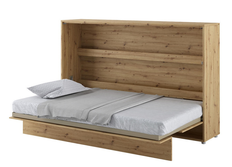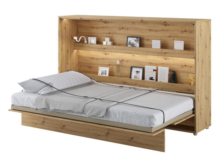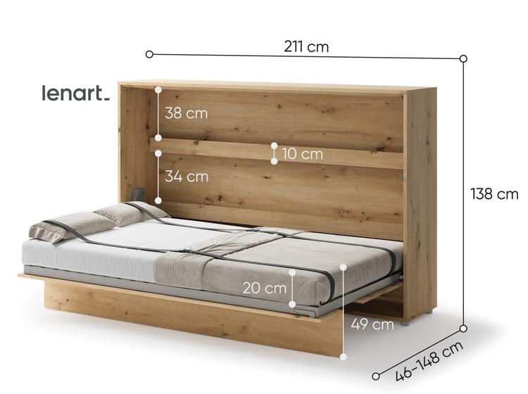 Široká výklopná postel 120 dub artisan. Rozměry viz obrázek. Se sklápěcí postelí Vás už nebude trápit malý prostor Vaší domácnosti. Díky stabilní konstrukci zaručuje pohodlný odpočinek. Pneumatický mechanismus sklápění postele zajistí bezpečné otevírání a je doplněn SOFT CLOSE systémem tichého zavírání. Tento výjimečný systém Vám umožní manipulaci pouze jedním prstem. Když je postel sklopená, vypadá jako běžná skříň. Vyklopením se vytáhne celá šířka postele. Při lozložení postele má hloubku 148 cm. Uvnitř skříně jsou praktické police na knížky nebo dekorační předměty, vše máte na dosah ruky. Maximální zatížení polic je 5 kg. Rám je nutno přišroubovat ke zdi, nosnost postele je 150 kg. Rošt postele je v ceně, matrace není součástí, je potřeba ji dokoupit. Doporučujeme velikost 120 × 200 x výšku do 18 cm. Po sklopení postele vzniká prostor pod postelí o výšce 24,9 cm. Nábytek je vyroben z kvalitního lamina s ABS hranou. Lamino je odolné proti poškrábání, poškození, vlhkosti a vysokým teplotám. Postel nabízíme v několika velikostech a barevných provedeních. K posteli je možné dokoupit LED osvětlení. Dodáváme v demontovaném stavu.Můžete si prohlédnout prezentační video, klikněte <a href=" CASA 73026