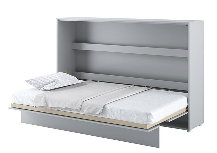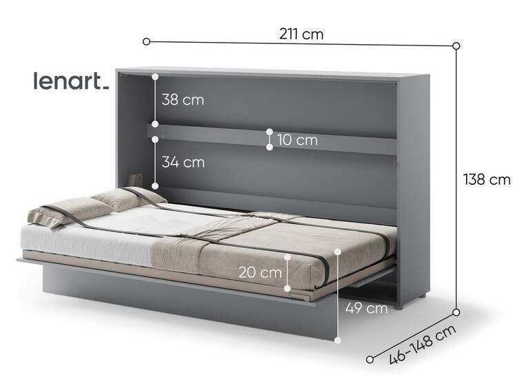 Široká výklopná postel 120 šedá mat. Rozměry viz obrázek. Se sklápěcí postelí Vás už nebude trápit malý prostor Vaší domácnosti. Díky stabilní konstrukci zaručuje pohodlný odpočinek. Pneumatický mechanismus sklápění postele zajistí bezpečné otevírání a je doplněn SOFT CLOSE systémem tichého zavírání. Tento výjimečný systém Vám umožní manipulaci pouze jedním prstem. Když je postel sklopená, vypadá jako běžná skříň. Vyklopením se vytáhne celá šířka postele. Při lozložení postele má hloubku 148 cm. Uvnitř skříně jsou praktické police na knížky nebo dekorační předměty, vše máte na dosah ruky. Maximální zatížení polic je 5 kg. Rám je nutno přišroubovat ke zdi, nosnost postele je 150 kg. Rošt postele je v ceně, matrace není součástí, je potřeba ji dokoupit. Doporučujeme velikost 120 × 200 x výšku do 18 cm. Po sklopení postele vzniká prostor pod postelí o výšce 24,9 cm. Nábytek je vyroben z kvalitního lamina s ABS hranou. Lamino je odolné proti poškrábání, poškození, vlhkosti a vysokým teplotám. Postel nabízíme v několika velikostech a barevných provedeních. K posteli je možné dokoupit LED osvětlení. Dodáváme v demontovaném stavu.Můžete si prohlédnout prezentační video, klikněte <a href=" CASA 73026