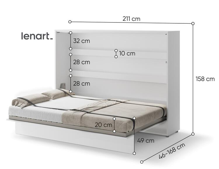 Široká výklopná postel 140 bílá mat. Rozměry viz obrázek. Se sklápěcí postelí Vás už nebude trápit malý prostor Vaší domácnosti. Díky stabilní konstrukci zaručuje pohodlný odpočinek. Pneumatický mechanismus sklápění postele zajistí bezpečné otevírání a je doplněn SOFT CLOSE systémem tichého zavírání. Tento výjimečný systém Vám umožní manipulaci pouze jedním prstem. Když je postel sklopená, vypadá jako běžná skříň. Vyklopením se vytáhne celá šířka postele. Při lozložení postele má hloubku 168 cm. Uvnitř skříně jsou praktické police na knížky nebo dekorační předměty, vše máte na dosah ruky. Maximální zatížení polic je 5 kg. Rám je nutno přišroubovat ke zdi, nosnost postele je 200 kg. Rošt postele je v ceně, matrace není součástí, je potřeba ji dokoupit. Doporučujeme velikost 140 × 200 x výšku do 18 cm. Po sklopení postele vzniká prostor pod postelí o výšce 24,9 cm. Nábytek je vyroben z kvalitního lamina s ABS hranou. Lamino je odolné proti poškrábání, poškození, vlhkosti a vysokým teplotám. Postel nabízíme v několika velikostech a barevných provedeních. K posteli je možné dokoupit LED osvětlení. Dodáváme v demontovaném stavu.Můžete si prohlédnout prezentační video, klikněte <a href=" CASA 73026
