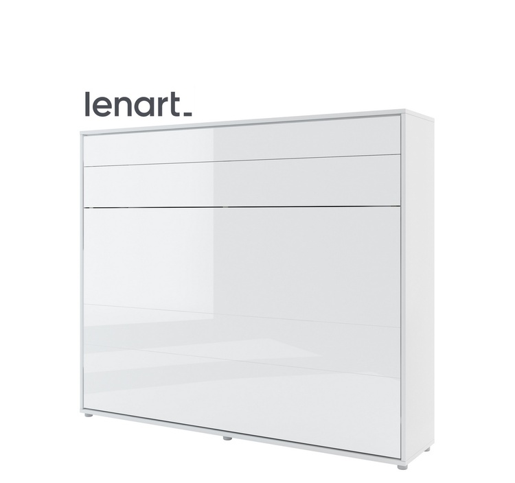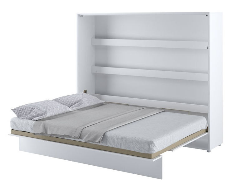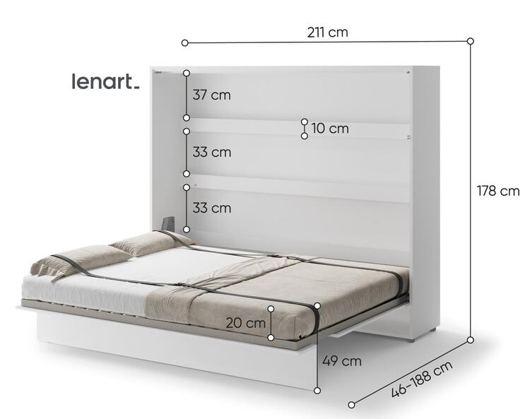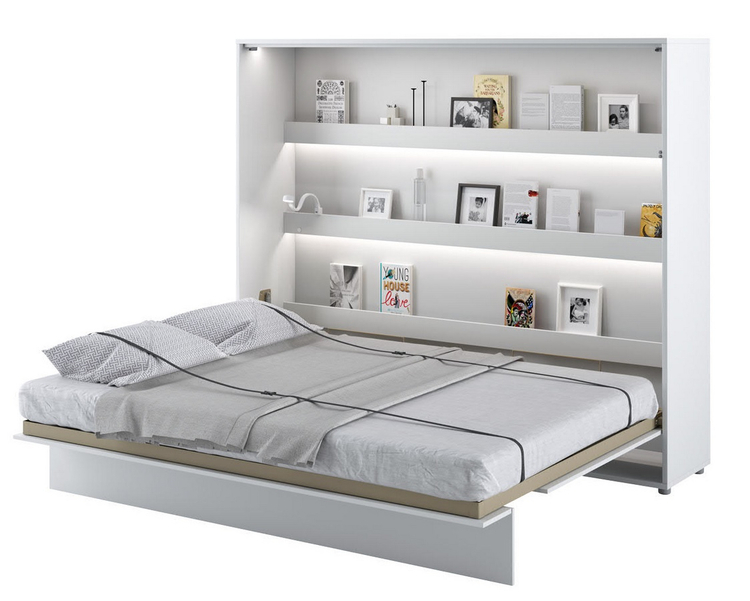 Široká výklopná postel 160 bílá lesk/bílá mat. Rozměry viz obrázek. Se sklápěcí postelí Vás už nebude trápit malý prostor Vaší domácnosti. Díky stabilní konstrukci zaručuje pohodlný odpočinek. Pneumatický mechanismus sklápění postele zajistí bezpečné otevírání a je doplněn SOFT CLOSE systémem tichého zavírání. Tento výjimečný systém Vám umožní manipulaci pouze jedním prstem. Když je postel sklopená, vypadá jako běžná skříň. Vyklopením se vytáhne celá šířka postele. Při lozložení postele má hloubku 188 cm. Uvnitř skříně jsou praktické police na knížky nebo dekorační předměty, vše máte na dosah ruky. Maximální zatížení polic je 5 kg. Rám je nutno přišroubovat ke zdi, nosnost postele je 200 kg. Rošt postele je v ceně, matrace není součástí, je potřeba ji dokoupit. Doporučujeme velikost 160 × 200 x výšku do 18 cm. Po sklopení postele vzniká prostor pod postelí o výšce 24,9 cm. Nábytek je vyroben z kvalitního lamina s ABS hranou. Lamino je odolné proti poškrábání, poškození, vlhkosti a vysokým teplotám. Postel nabízíme v několika velikostech a barevných provedeních. K posteli je možné dokoupit LED osvětlení. Dodáváme v demontovaném stavu.Můžete si prohlédnout prezentační video, klikněte <a href=" CASA 73026