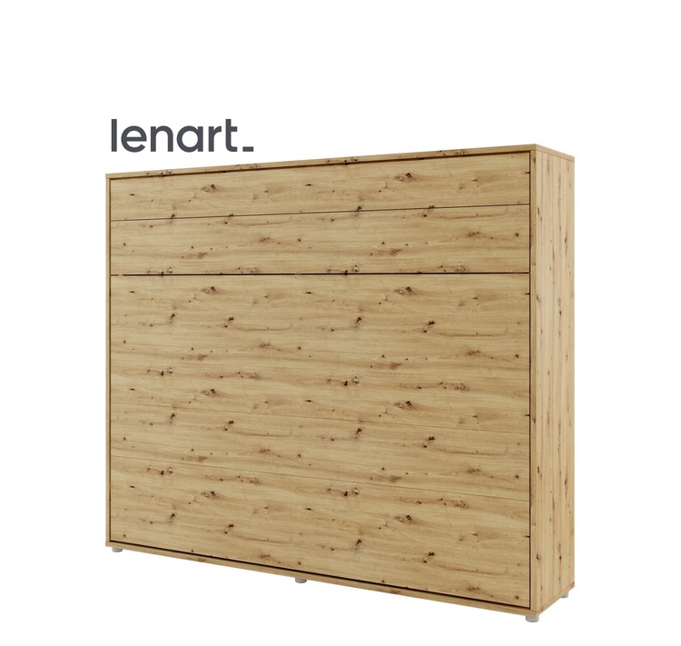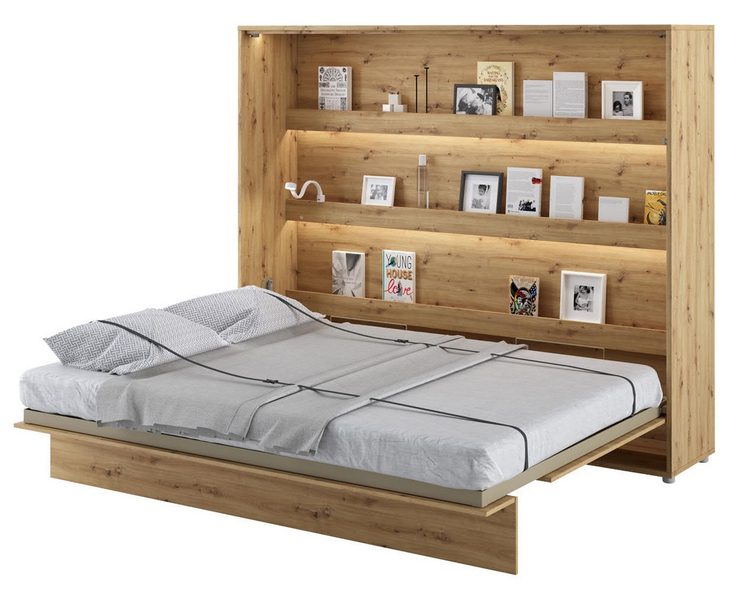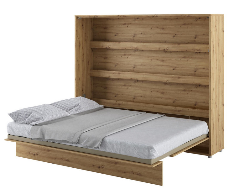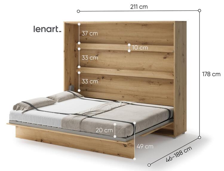 Široká výklopná postel 160 dub artisan. Rozměry viz obrázek. Se sklápěcí postelí Vás už nebude trápit malý prostor Vaší domácnosti. Díky stabilní konstrukci zaručuje pohodlný odpočinek. Pneumatický mechanismus sklápění postele zajistí bezpečné otevírání a je doplněn SOFT CLOSE systémem tichého zavírání. Tento výjimečný systém Vám umožní manipulaci pouze jedním prstem. Když je postel sklopená, vypadá jako běžná skříň. Vyklopením se vytáhne celá šířka postele. Při lozložení postele má hloubku 188 cm. Uvnitř skříně jsou praktické police na knížky nebo dekorační předměty, vše máte na dosah ruky. Maximální zatížení polic je 5 kg. Rám je nutno přišroubovat ke zdi, nosnost postele je 200 kg. Rošt postele je v ceně, matrace není součástí, je potřeba ji dokoupit. Doporučujeme velikost 160 × 200 x výšku do 18 cm. Po sklopení postele vzniká prostor pod postelí o výšce 24,9 cm. Nábytek je vyroben z kvalitního lamina s ABS hranou. Lamino je odolné proti poškrábání, poškození, vlhkosti a vysokým teplotám. Postel nabízíme v několika velikostech a barevných provedeních. K posteli je možné dokoupit LED osvětlení. Dodáváme v demontovaném stavu.Můžete si prohlédnout prezentační video, klikněte <a href=" CASA 73026