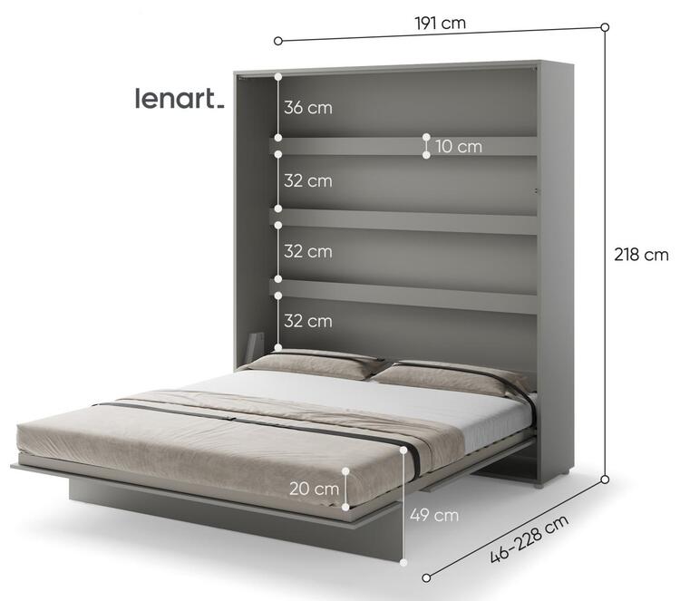 Vysoká výklopná postel 180 šedá mat. Rozměry viz obrázek. Se sklápěcí postelí Vás už nebude trápit malý prostor Vaší domácnosti. Díky stabilní konstrukci zaručuje pohodlný odpočinek. Pneumatický mechanismus sklápění postele zajistí bezpečné otevírání a je doplněn SOFT CLOSE systémem tichého zavírání. Tento výjimečný systém Vám umožní manipulaci pouze jedním prstem. Když je postel sklopená, vypadá jako běžná skříň. Vyklopením se vytáhne celá délka postele. Při lozložení postele má hloubku 228 cm. Uvnitř skříně jsou praktické police na knížky nebo dekorační předměty, vše máte na dosah ruky. Maximální zatížení polic je 5 kg. Rám je nutno přišroubovat ke zdi, nosnost postele je 200 kg. Rošt postele je v ceně, matrace není součástí, je potřeba ji dokoupit. Doporučujeme velikost 180 × 200 x výšku do 18 cm. Po sklopení postele vzniká prostor pod postelí o výšce 24,9 cm. Nábytek je vyroben z kvalitního lamina s ABS hranou. Lamino je odolné proti poškrábání, poškození, vlhkosti a vysokým teplotám. Postel nabízíme v několika velikostech a barevných provedeních. K posteli je možné dokoupit LED osvětlení. Dodáváme v demontovaném stavu.Můžete si prohlédnout prezentační video, klikněte <a href=" CASA 73026