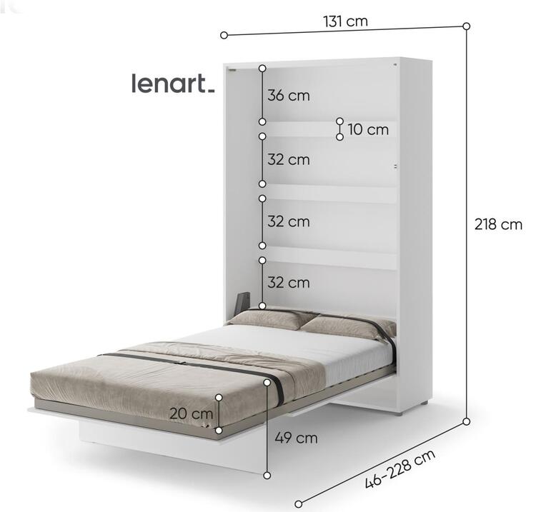 Vysoká výklopná postel 120 bílá mat. Rozměry viz obrázek. Se sklápěcí postelí Vás už nebude trápit malý prostor Vaší domácnosti. Díky stabilní konstrukci zaručuje pohodlný odpočinek. Pneumatický mechanismus sklápění postele zajistí bezpečné otevírání a je doplněn SOFT CLOSE systémem tichého zavírání. Tento výjimečný systém Vám umožní manipulaci pouze jedním prstem. Když je postel sklopená, vypadá jako běžná skříň. Při lozložení postele má hloubku 228 cm. Vyklopením se vytáhne celá délka postele. Uvnitř skříně jsou praktické police na knížky nebo dekorační předměty, vše máte na dosah ruky. Maximální zatížení polic je 5 kg. Rám je nutno přišroubovat ke zdi, nosnost postele je 150 kg. Rošt postele je v ceně, matrace není součástí, je potřeba ji dokoupit. Doporučujeme velikost 120 × 200 x výšku do 18 cm. Po sklopení postele vzniká prostor pod postelí o výšce 24,9 cm. Nábytek je vyroben z kvalitního lamina s ABS hranou. Lamino je odolné proti poškrábání, poškození, vlhkosti a vysokým teplotám. Postel nabízíme v několika velikostech a barevných provedeních. K posteli je možné dokoupit LED osvětlení. Dodáváme v demontovaném stavu.Můžete si prohlédnout prezentační video, klikněte <a href=" CASA 73026