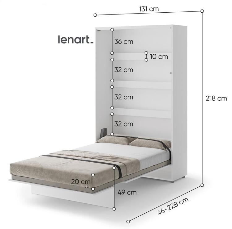 Vysoká výklopná postel 120 bílá lesk/bílá mat. Rozměry viz obrázek. Se sklápěcí postelí Vás už nebude trápit malý prostor Vaší domácnosti. Díky stabilní konstrukci zaručuje pohodlný odpočinek. Pneumatický mechanismus sklápění postele zajistí bezpečné otevírání a je doplněn SOFT CLOSE systémem tichého zavírání. Tento výjimečný systém Vám umožní manipulaci pouze jedním prstem. Když je postel sklopená, vypadá jako běžná skříň. Vyklopením se vytáhne celá délka postele. Při lozložení postele má hloubku 228 cm. Uvnitř skříně jsou praktické police na knížky nebo dekorační předměty, vše máte na dosah ruky. Maximální zatížení polic je 5 kg. Rám je nutno přišroubovat ke zdi, nosnost postele je 150 kg. Rošt postele je v ceně, matrace není součástí, je potřeba ji dokoupit. Doporučujeme velikost 120 × 200 x výšku do 18 cm. Po sklopení postele vzniká prostor pod postelí o výšce 24,9 cm. Nábytek je vyroben z kvalitního lamina s ABS hranou. Lamino je odolné proti poškrábání, poškození, vlhkosti a vysokým teplotám. Postel nabízíme v několika velikostech a barevných provedeních. K posteli je možné dokoupit LED osvětlení. Dodáváme v demontovaném stavu.Můžete si prohlédnout prezentační video, klikněte <a href=" CASA 73026