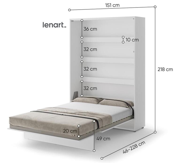 Vysoká výklopná postel 140 bílá lesk/bílá mat. Se sklápěcí postelí Vás už nebude trápit malý prostor Vaší domácnosti. Díky stabilní konstrukci zaručuje pohodlný odpočinek. Pneumatický mechanismus sklápění postele zajistí bezpečné otevírání a je doplněn SOFT CLOSE systémem tichého zavírání. Tento výjimečný systém Vám umožní manipulaci pouze jedním prstem. Když je postel sklopená, vypadá jako běžná skříň. Vyklopením se vytáhne celá délka postele. Při lozložení postele má hloubku 228 cm. Uvnitř skříně jsou praktické police na knížky nebo dekorační předměty, vše máte na dosah ruky. Maximální zatížení polic je 5 kg. Rám je nutno přišroubovat ke zdi, nosnost postele je 200 kg. Rošt postele je v ceně, matrace není součástí, je potřeba ji dokoupit. Doporučujeme velikost 140 × 200 x výšku do 18 cm. Po sklopení postele vzniká prostor pod postelí o výšce 24,9 cm. Nábytek je vyroben z kvalitního lamina s ABS hranou. Lamino je odolné proti poškrábání, poškození, vlhkosti a vysokým teplotám. Postel nabízíme v několika velikostech a barevných provedeních. K posteli je možné dokoupit LED osvětlení. Dodáváme v demontovaném stavu.Můžete si prohlédnout prezentační video, klikněte <a href=" CASA 73026