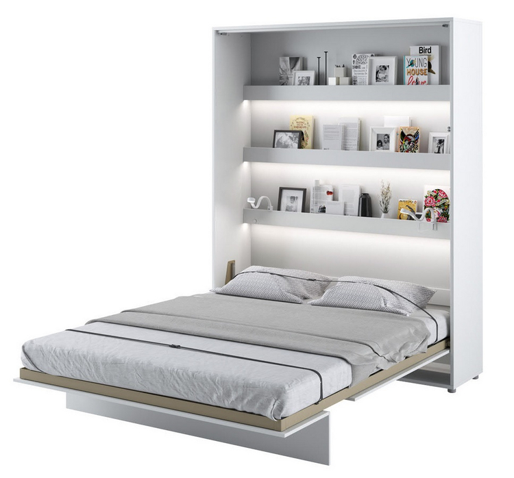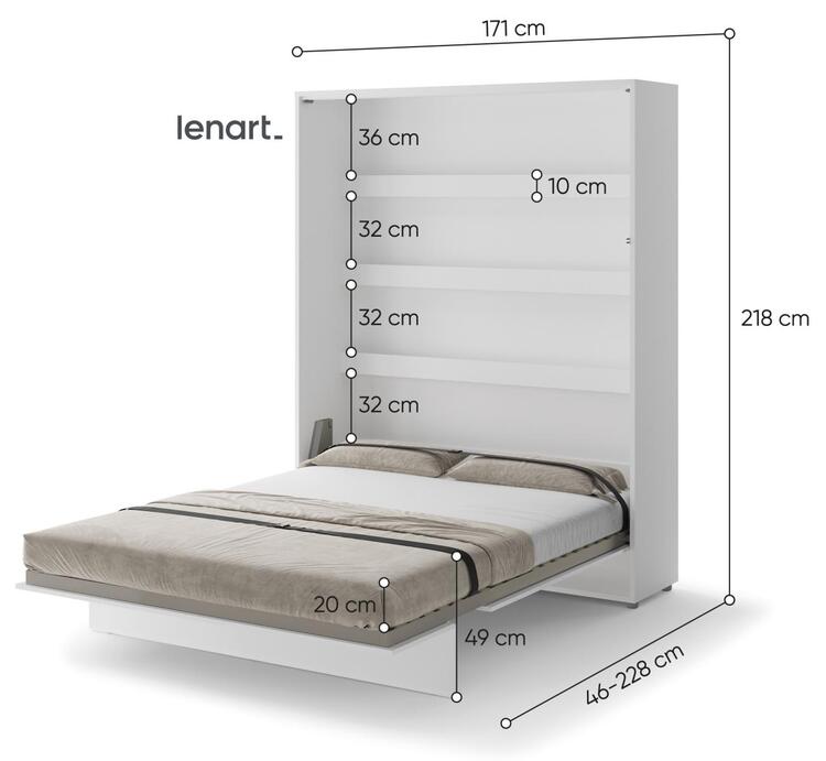 Vysoká výklopná postel 160 bílá lesk/bílá mat. Rozměry viz obrázek. Se sklápěcí postelí Vás už nebude trápit malý prostor Vaší domácnosti. Díky stabilní konstrukci zaručuje pohodlný odpočinek. Pneumatický mechanismus sklápění postele zajistí bezpečné otevírání a je doplněn SOFT CLOSE systémem tichého zavírání. Tento výjimečný systém Vám umožní manipulaci pouze jedním prstem. Když je postel sklopená, vypadá jako běžná skříň. Vyklopením se vytáhne celá délka postele. Při lozložení postele má hloubku 228 cm. Uvnitř skříně jsou praktické police na knížky nebo dekorační předměty, vše máte na dosah ruky. Rám je nutno přišroubovat ke zdi, nosnost postele je 200 kg. Rošt postele je v ceně, matrace není součástí, je potřeba ji dokoupit. Doporučujeme velikost 160 × 200 x výšku do 18 cm. Po sklopení postele vzniká prostor pod postelí o výšce 20,4 cm. Nábytek je vyroben z kvalitního lamina s ABS hranou. Lamino je odolné proti poškrábání, poškození, vlhkosti a vysokým teplotám. Postel nabízíme v několika velikostech a barevných provedeních. K posteli je možné dokoupit LED osvětlení. Dodáváme v demontovaném stavu.Můžete si prohlédnout prezentační video, klikněte <a href=" CASA 73026
