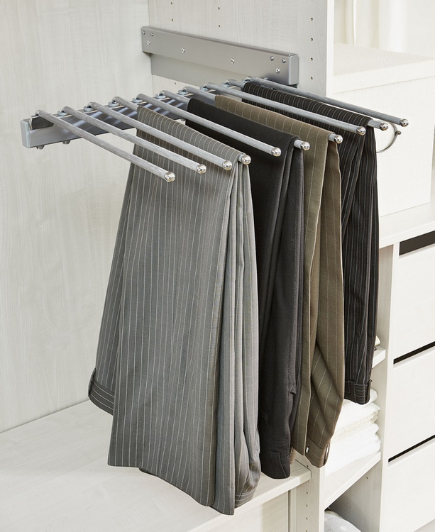 Výsuvný věšák na kalhoty. Tento praktický věšák Vám umožní přehledně uspořádat kalhoty ve Vaší skříni. Díky výsuvné funkci tak máte ideálního pomocníka při výběru toho správného kousku Vašeho oblečení. Určeno pro skříně s posuvnými a křídlovými dveřmi.CASA 24002