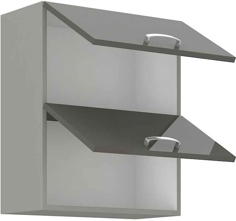 Horní výklopná skříňka dvojitá GREY vyrobená z kvalitního lamina a MDF. Korpus je v barvě šedá a dvířka v barvě grey šedá v lesku. Rozměry skříňky – šířka 60 cm, výška 71,5 cm, hloubka 31 cm. Úchyty jsou z kovu. Dvířka jsou pomocí plynových pístů otvíraná nahoru. V naší nabídce naleznete další výběr skříněk k sestavení celé kuchyně.CASA 87001